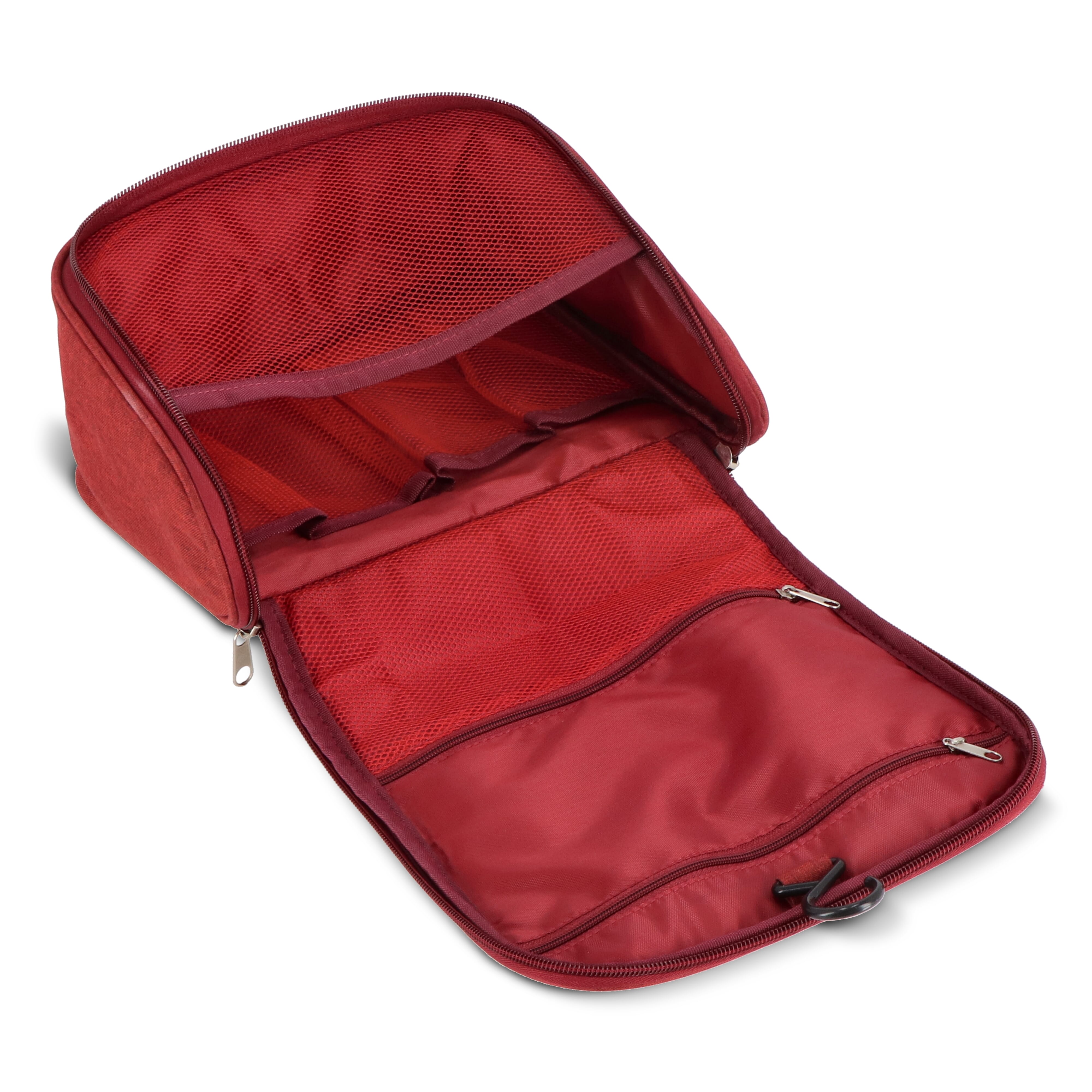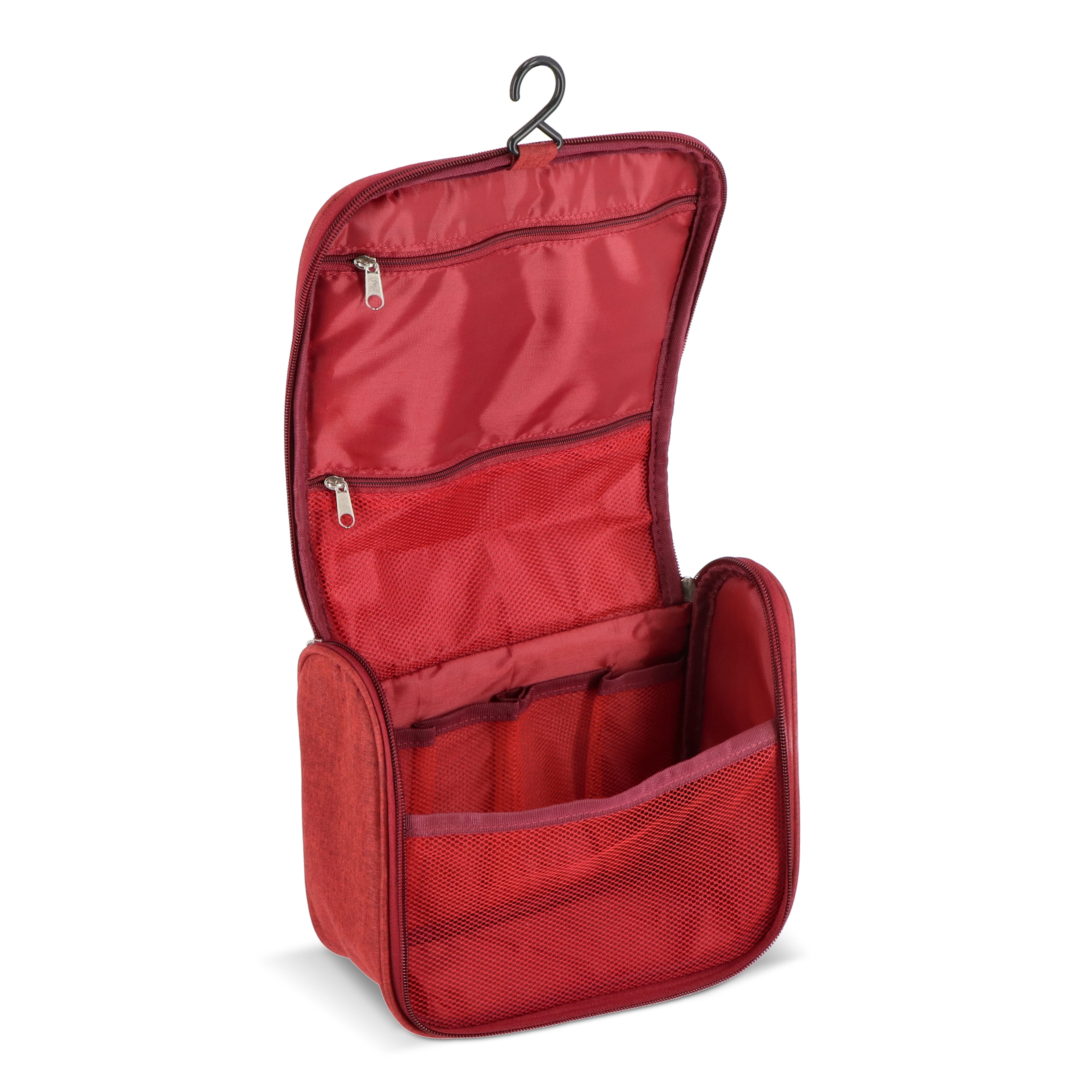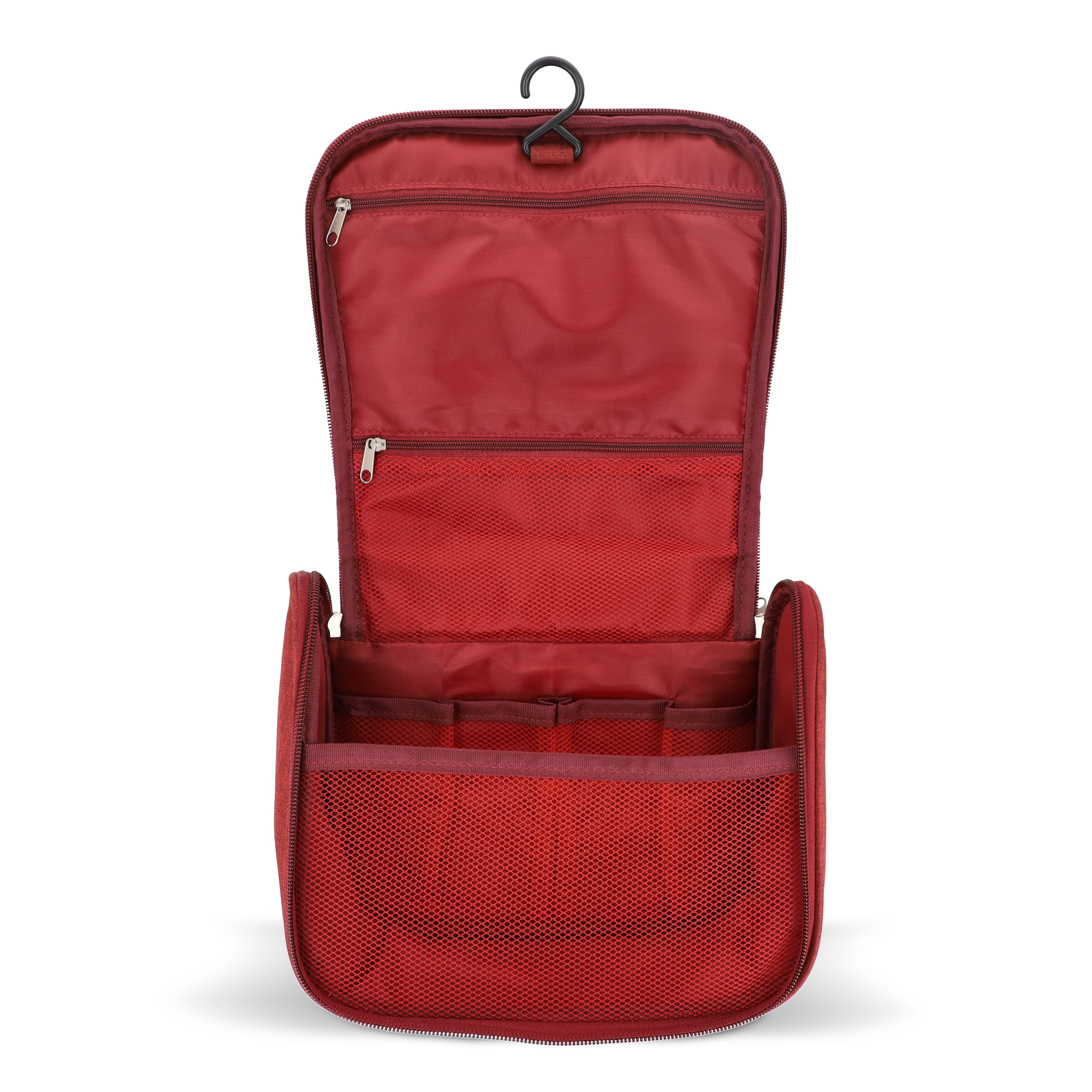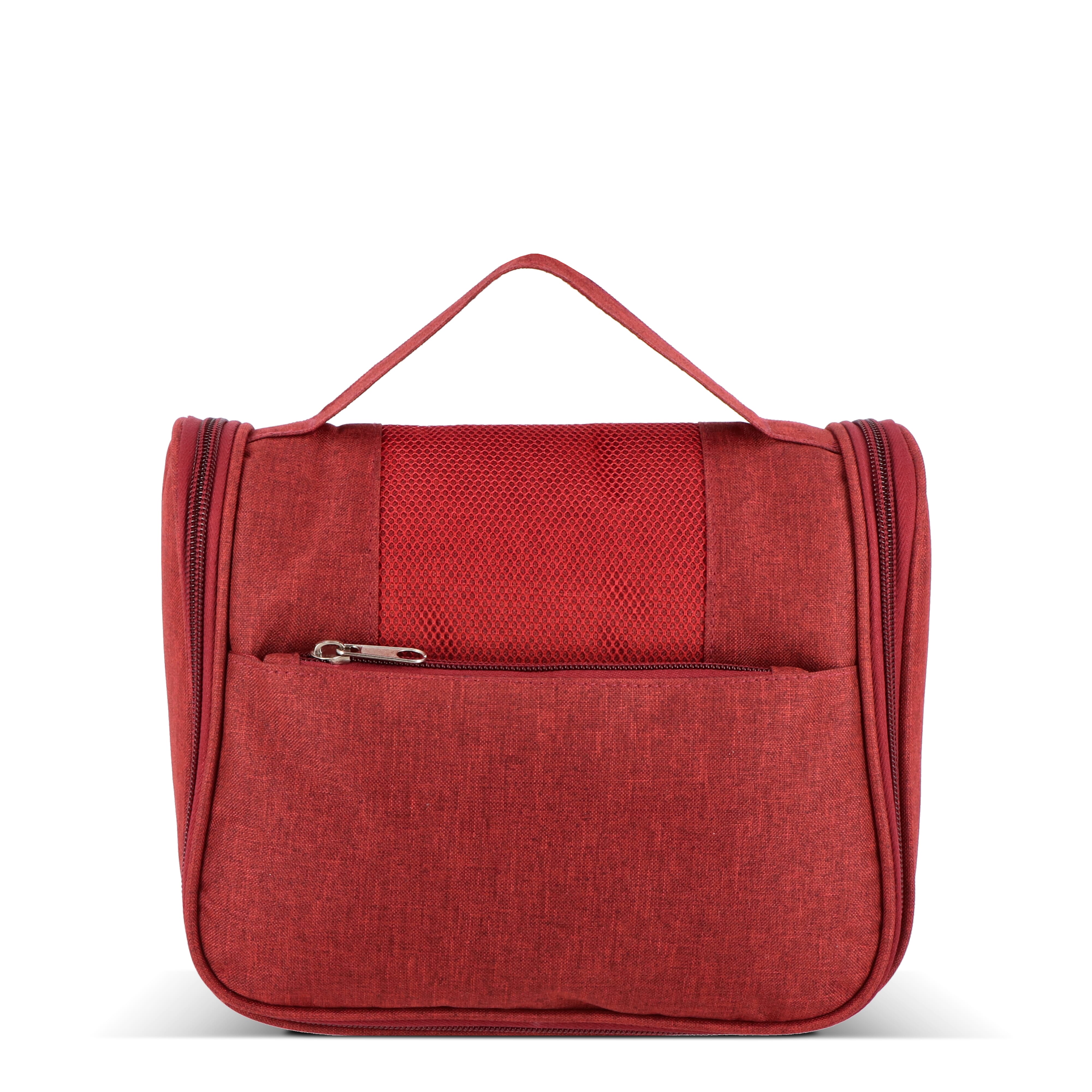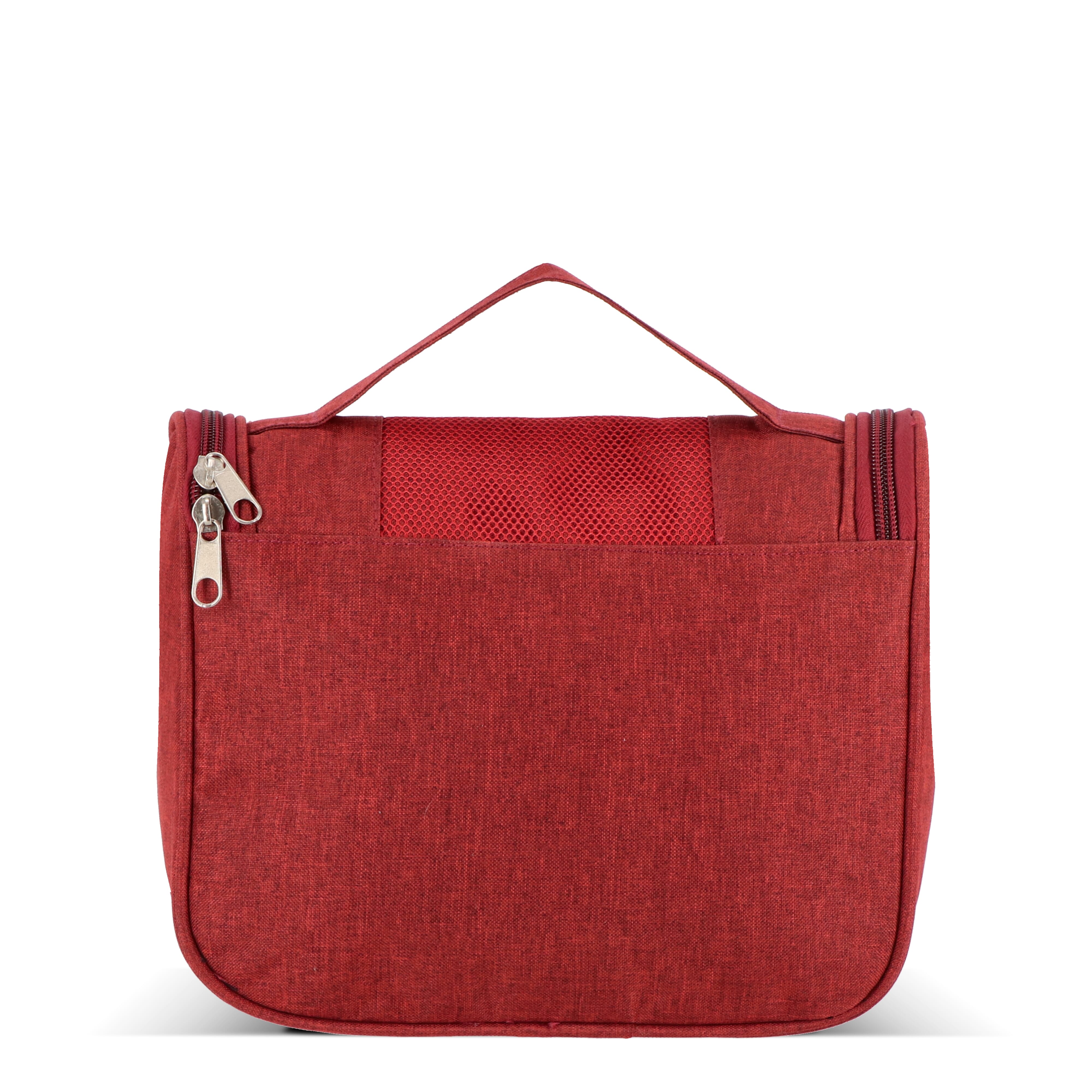 Kulturbeutel aus 300D rPET mit Fronttasche mit Reißverschluss und Tragegriff oben. Innen mit Aufhängehaken, zwei Reißverschlussfächern (eines davon aus Netzgewebe), vier offenen Netztaschen für Flaschen in Reisegröße und einem großen Hauptfach für andere Kosmetikartikel. Ideal für organisiertes Reisen.