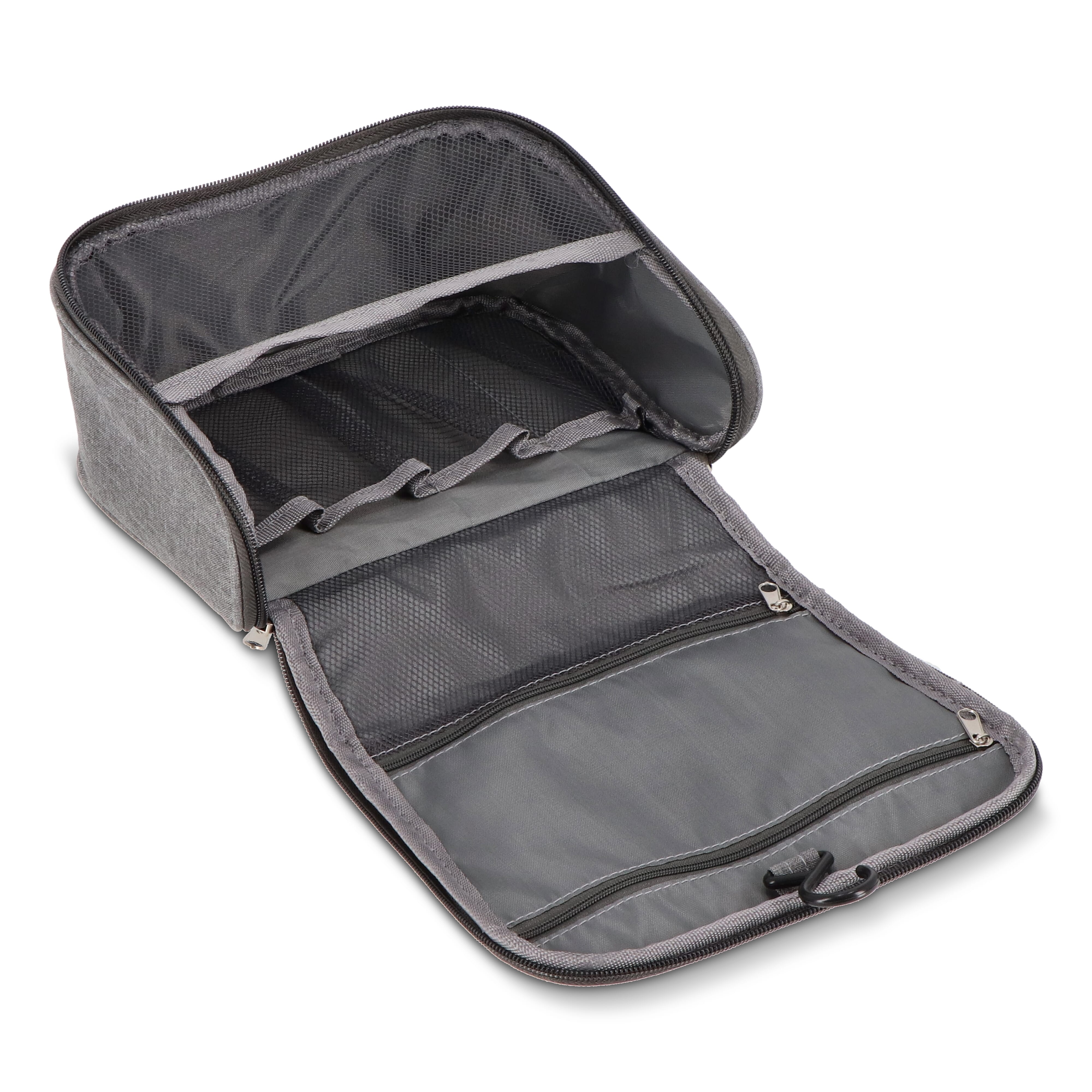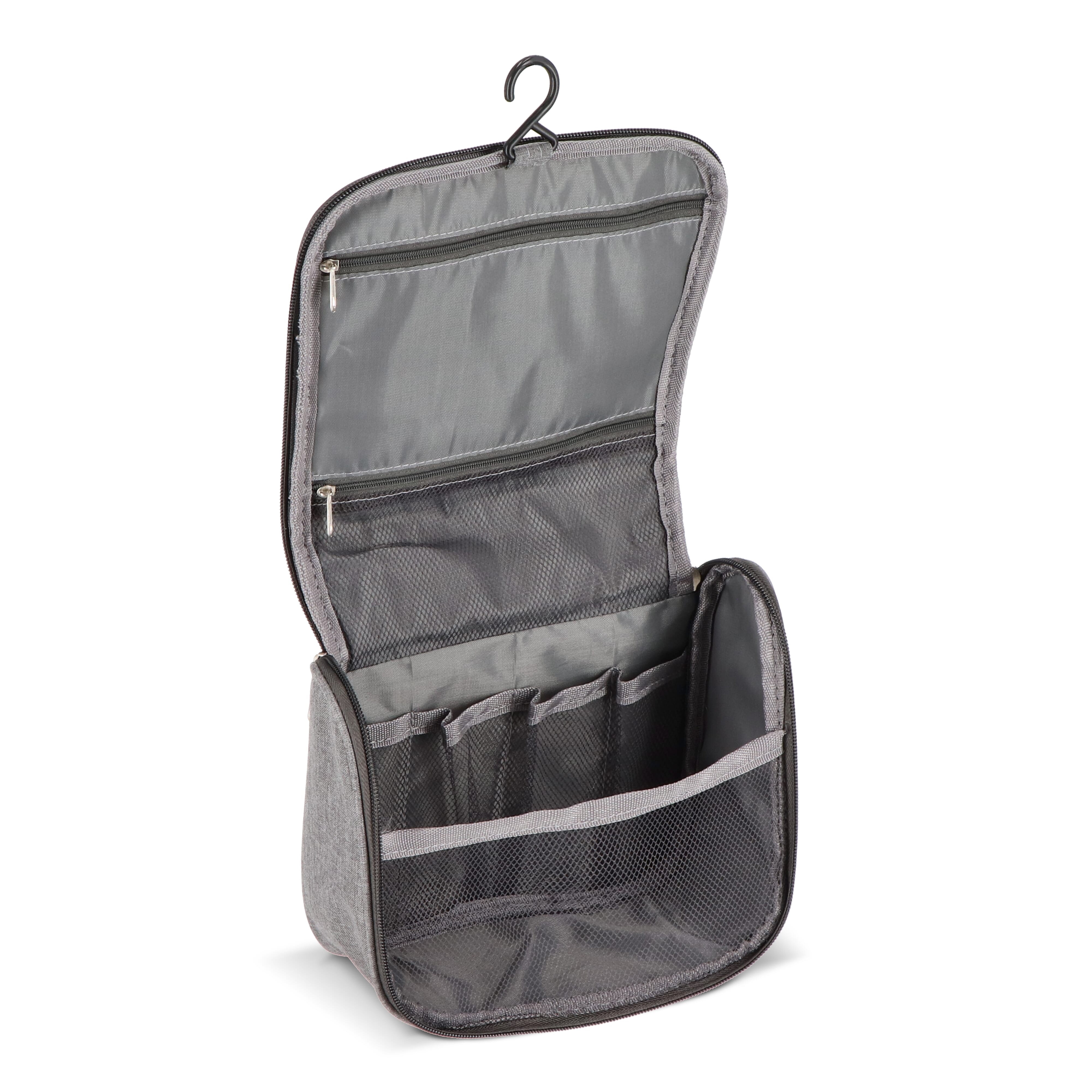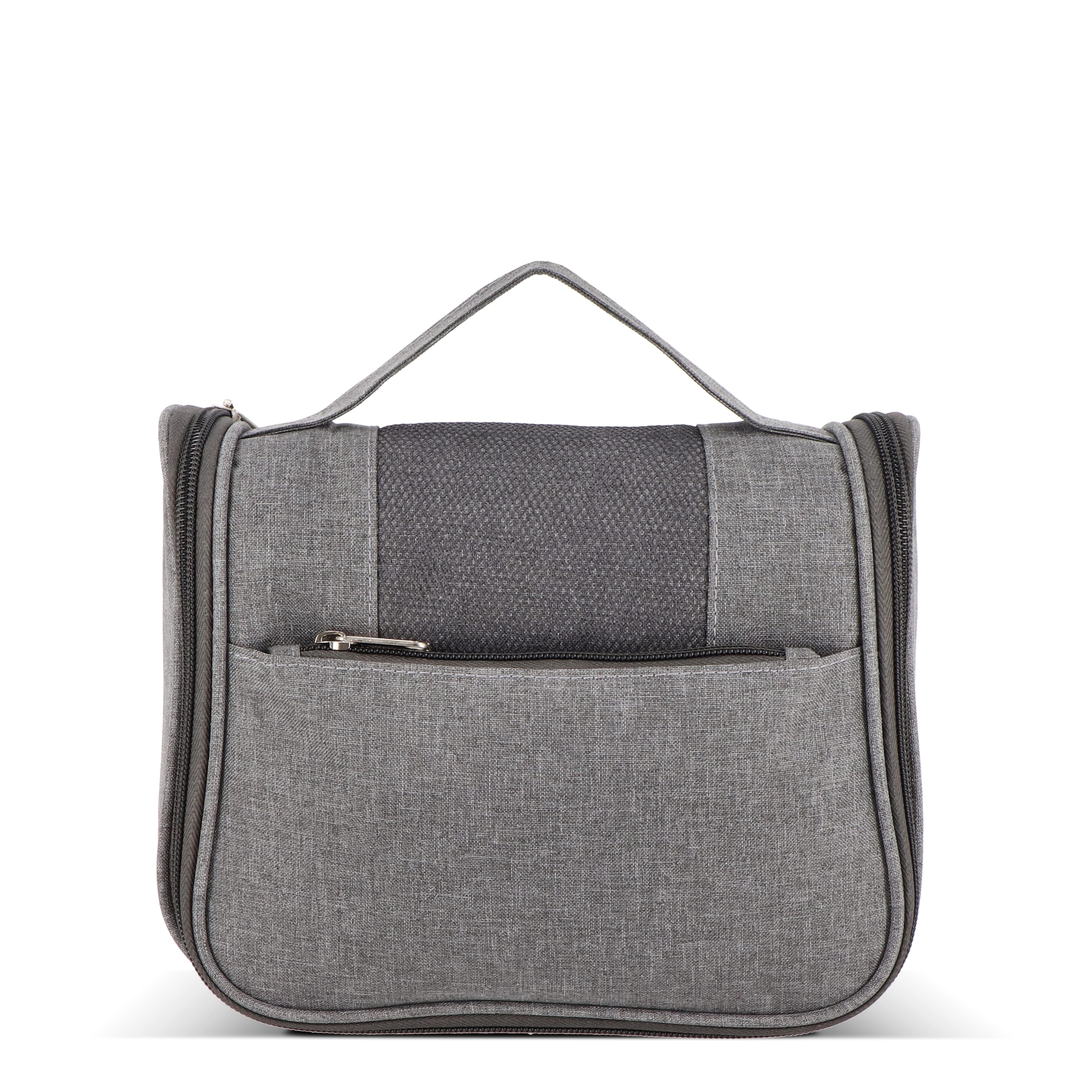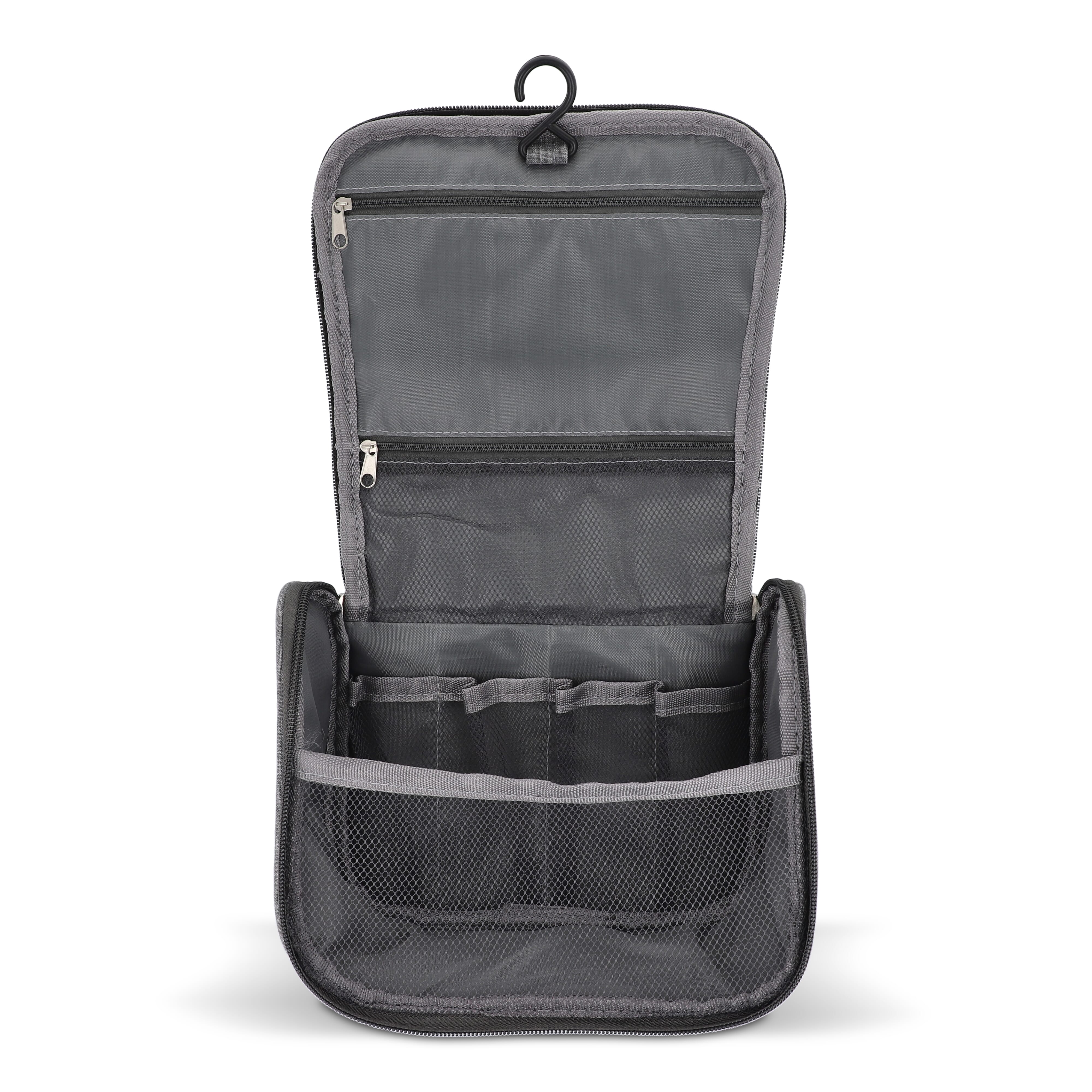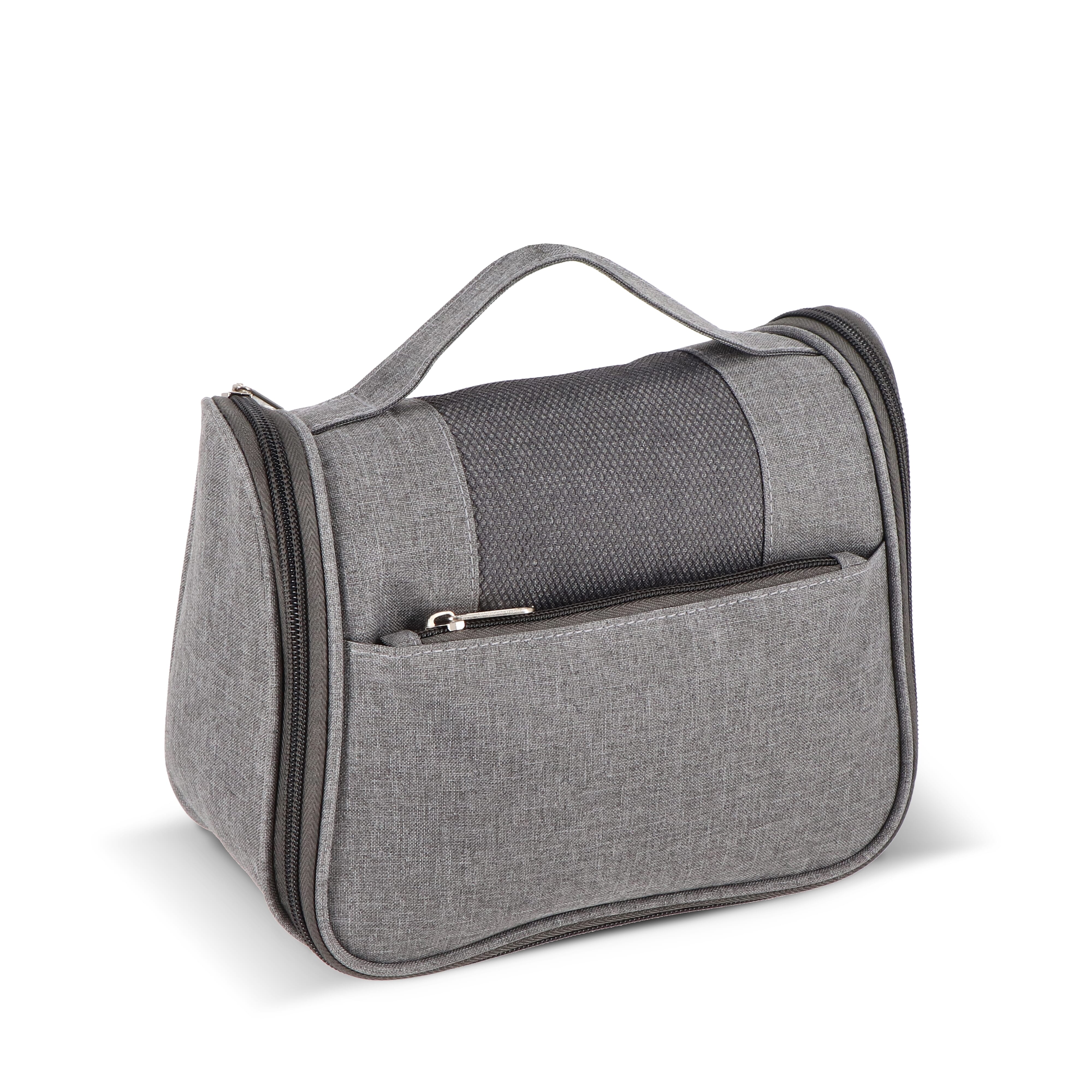 Kulturbeutel aus 300D rPET mit Fronttasche mit Reißverschluss und Tragegriff oben. Innen mit Aufhängehaken, zwei Reißverschlussfächern (eines davon aus Netzgewebe), vier offenen Netztaschen für Flaschen in Reisegröße und einem großen Hauptfach für andere Kosmetikartikel. Ideal für organisiertes Reisen.