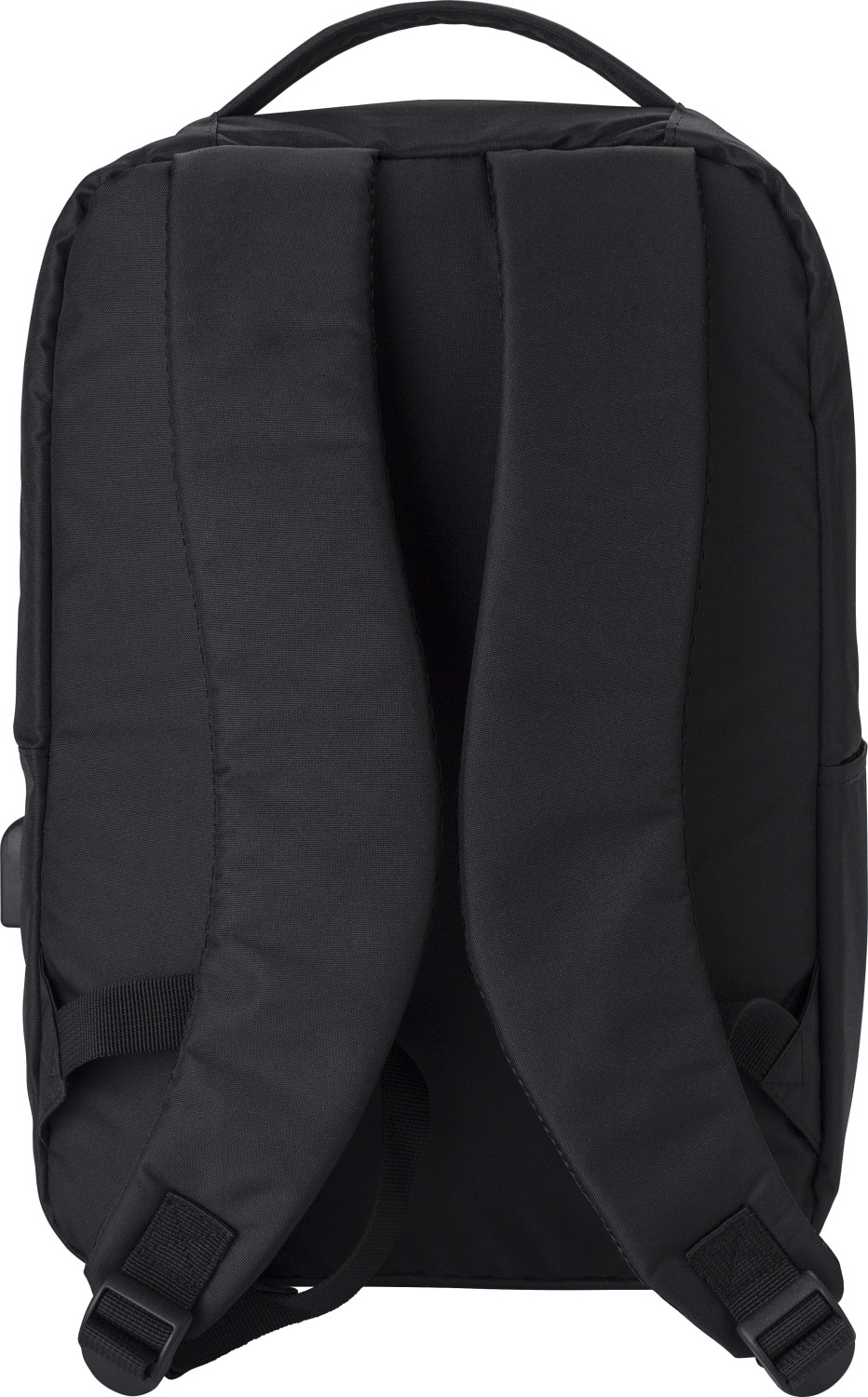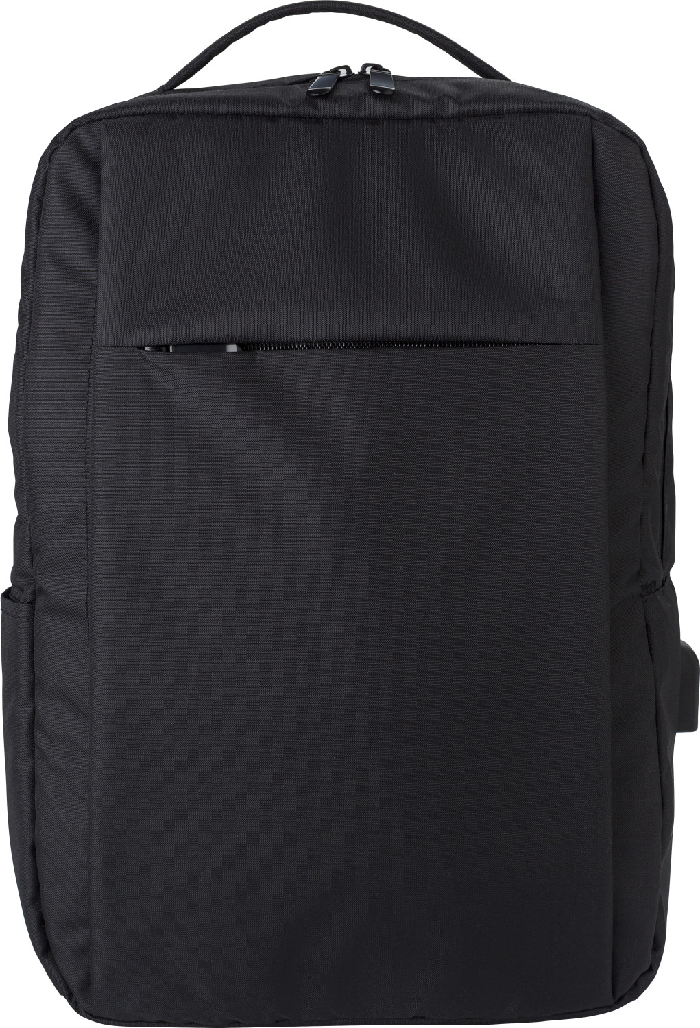 RPET (300D) Laptop (16 Zoll) Rucksack mit 210D Details. Innen mit mehreren Taschen, Laptop-Tasche mit Klettverschluss, eine Fronttasche mit Reißverschluss. Öffnung mit USB-A an der Seite.