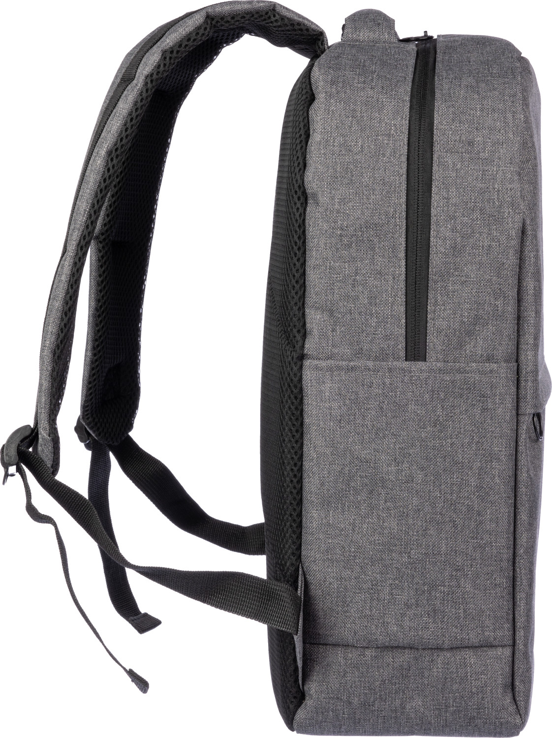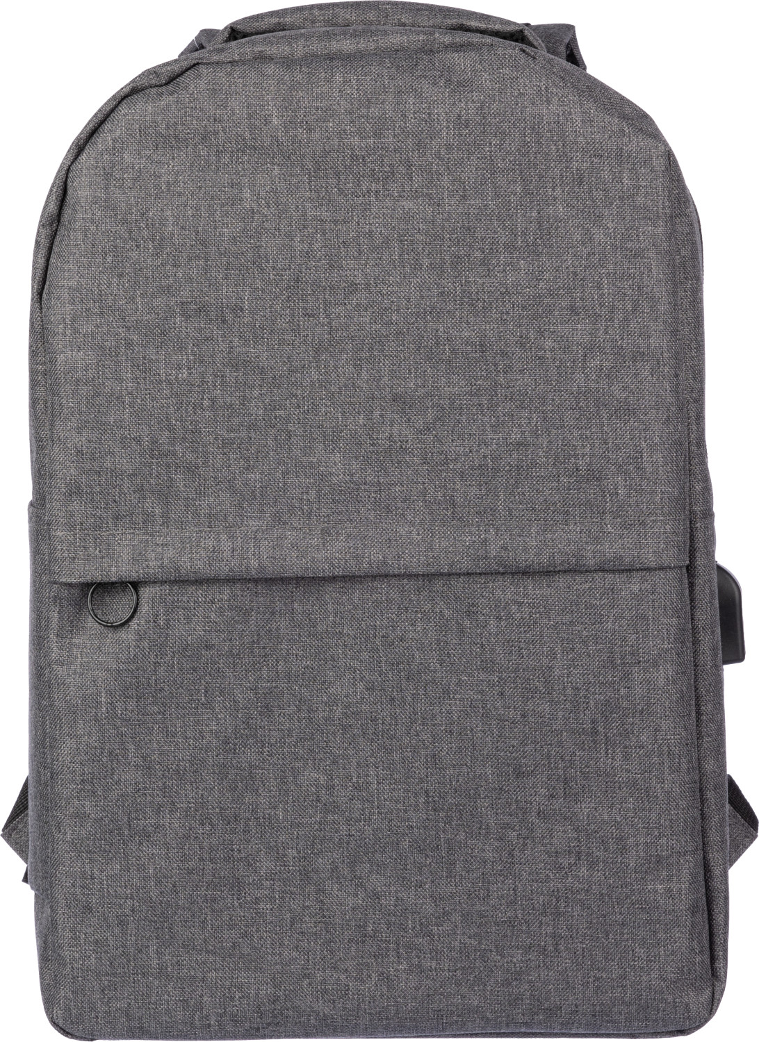 RPET (600D) Rucksack mit USB-Anschlussöffnung (und USB-Kabel innen) mit einem großen Reißverschlussfach auf der Oberseite und einer Reißverschlusstasche auf der Vorderseite. Im Inneren befindet sich ein Fach für 10-Zoll-Geräte und eines für 15-Zoll-Geräte. Mit verstellbaren Griffen.