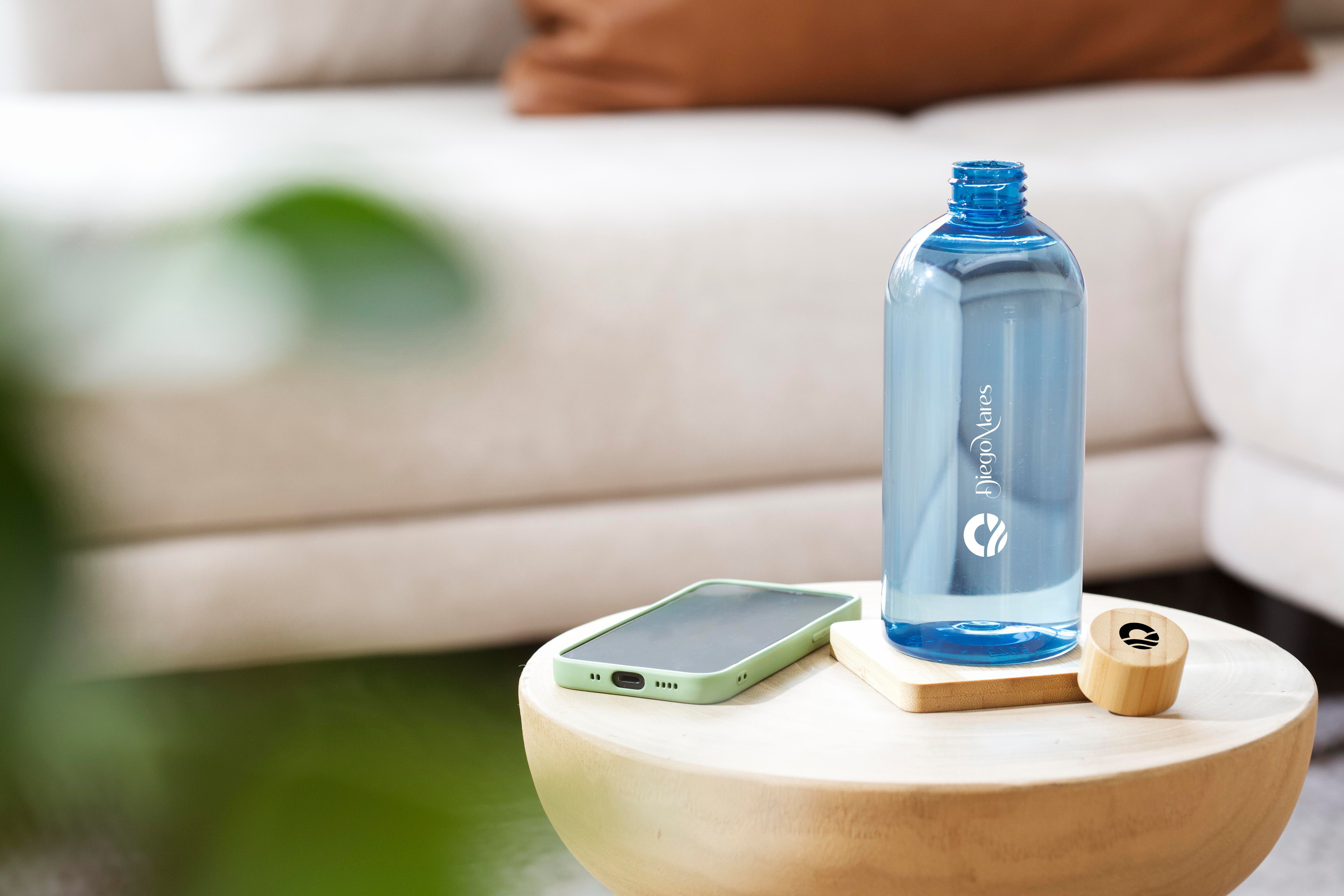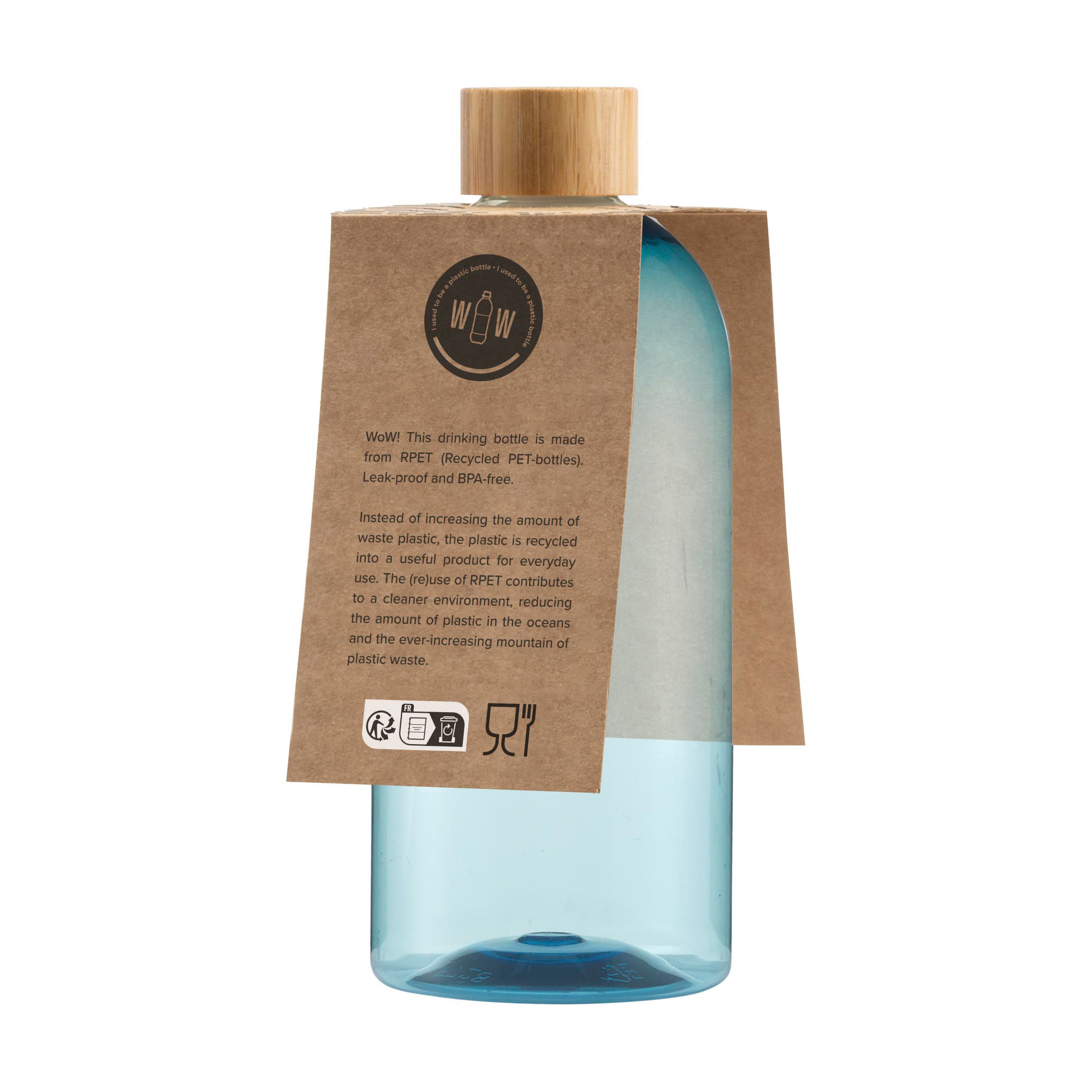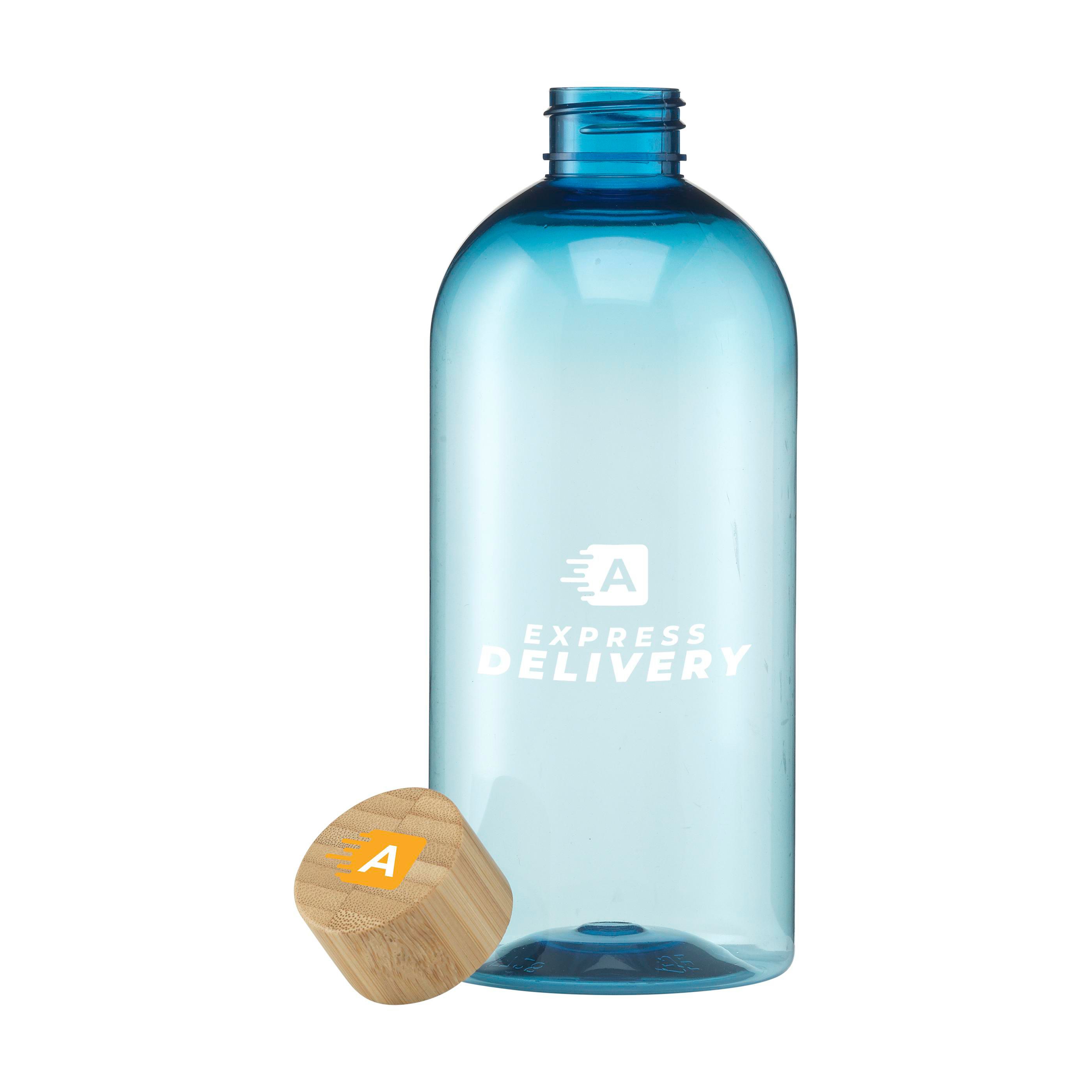 Trinkflasche aus 100% RPET. Mit Schraubverschluss aus Bambus. Auslaufsicher. Nicht spülmaschinengeeignet. Fassungsvermögen 500 ml. Hergestellt in Europa.
