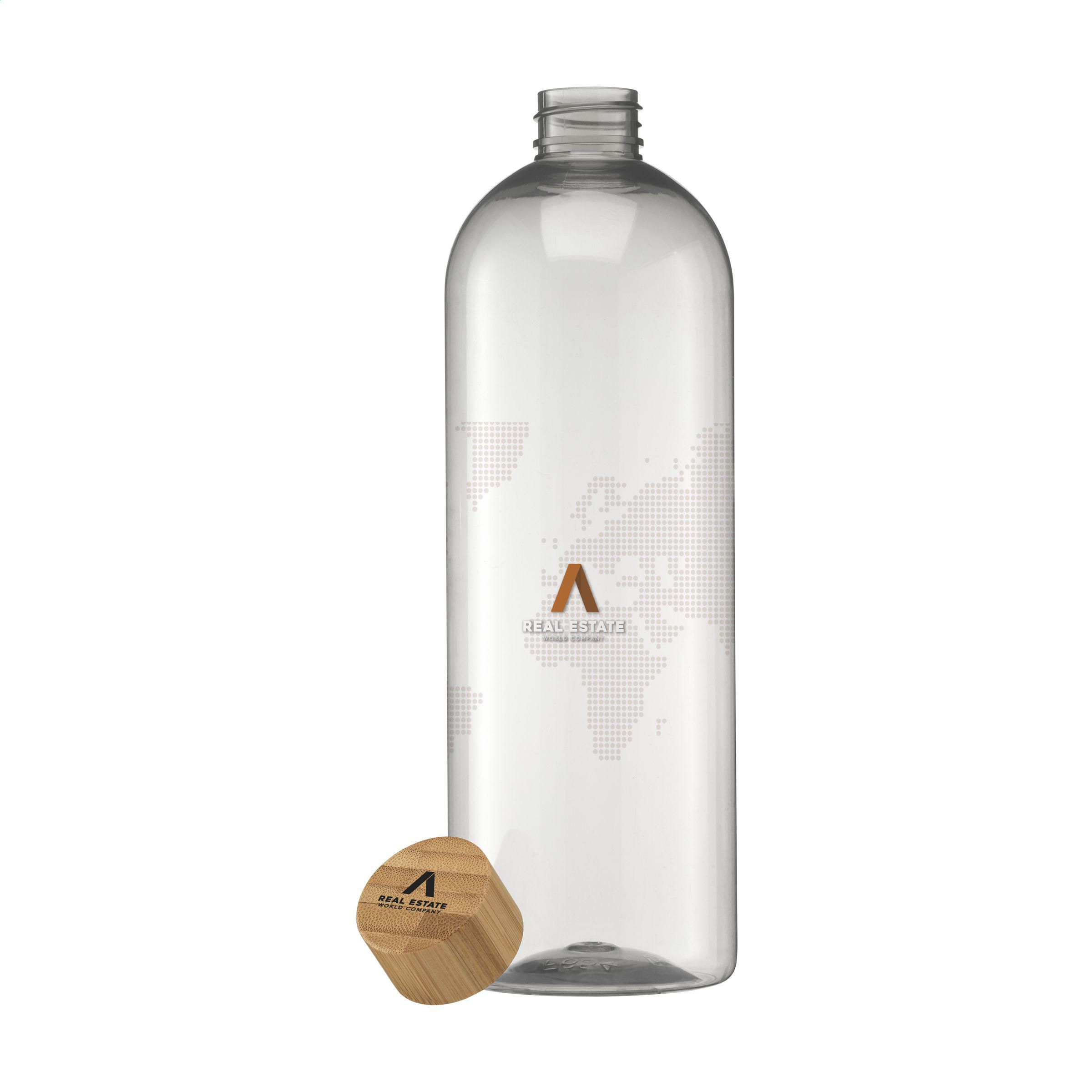 Trinkflasche aus 100% RPET. Mit Schraubverschluss aus Bambus. Auslaufsicher. Nicht spülmaschinengeeignet. Fassungsvermögen 750 ml. Hergestellt in Europa.