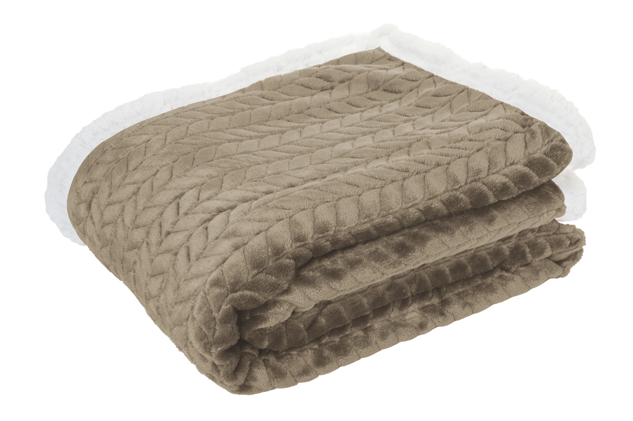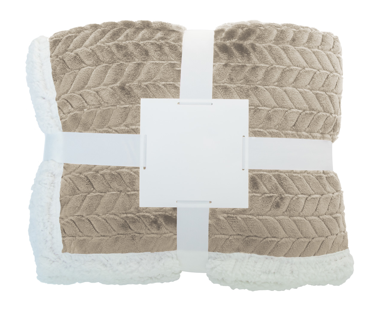 Zweilagige RPET-Decke mit Jacquardmuster. Mit 240 g / m² RPET-Flanellfleece und wendbarem 210 g / m² RPET-Sherpa-Fleecefutter. Eingewickelt mit einem Band und bedruckbarer Papierkarte.