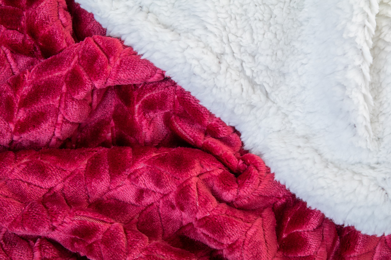 Zweilagige RPET-Decke mit Jacquardmuster. Mit 240 g / m² RPET-Flanellfleece und wendbarem 210 g / m² RPET-Sherpa-Fleecefutter. Eingewickelt mit einem Band und bedruckbarer Papierkarte.
