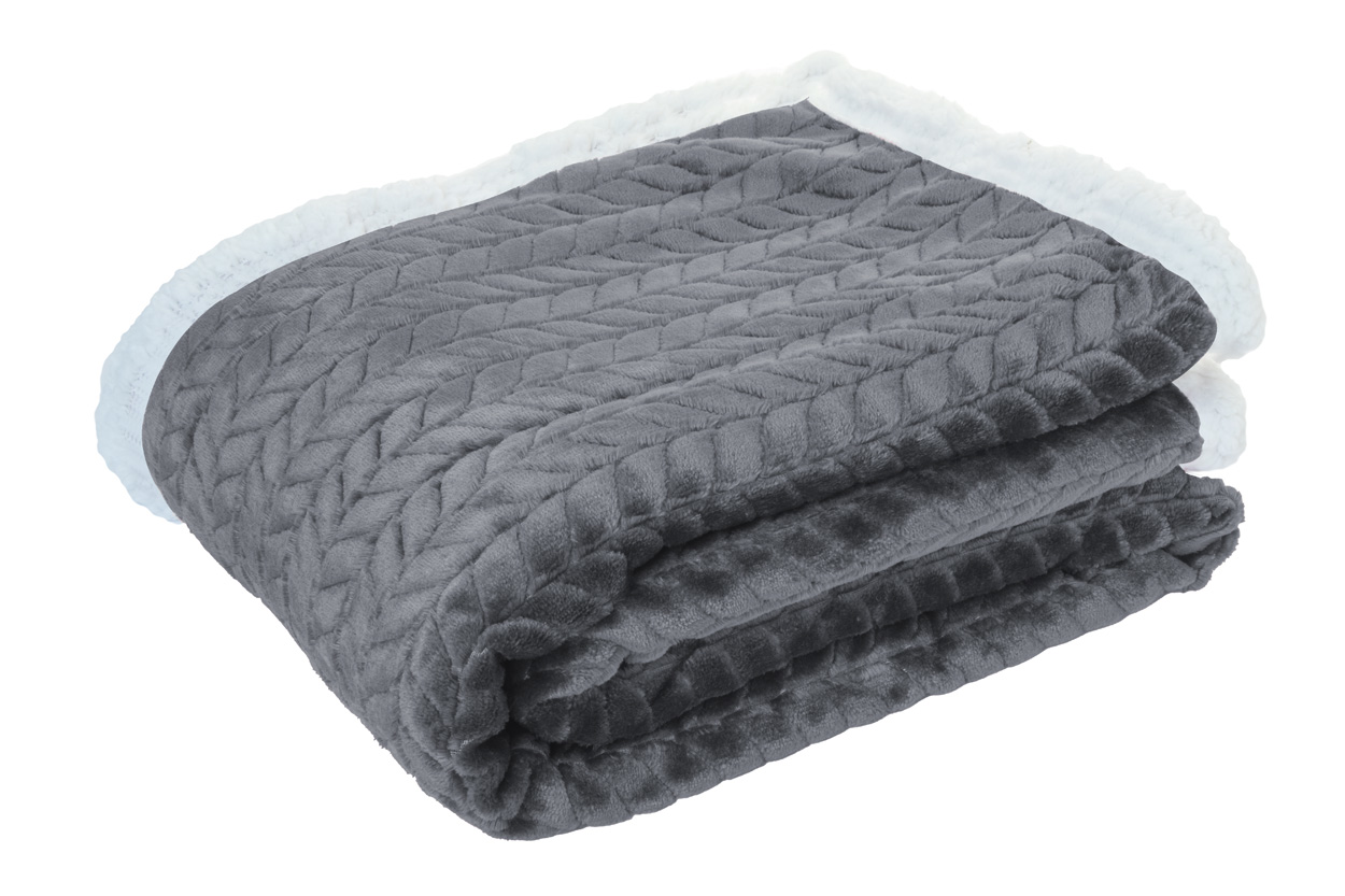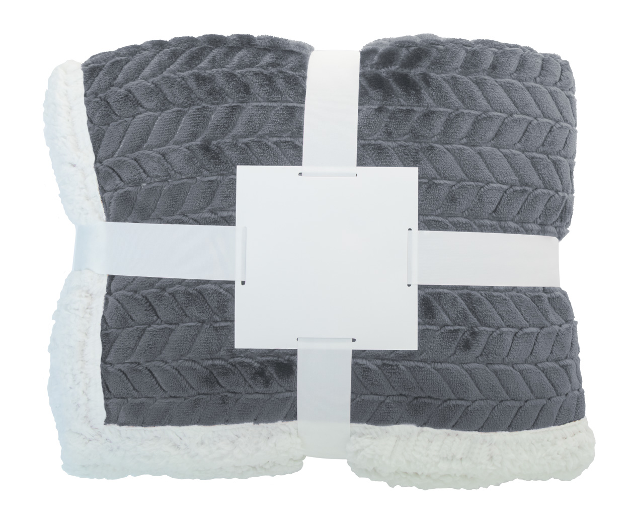 Zweilagige RPET-Decke mit Jacquardmuster. Mit 240 g / m² RPET-Flanellfleece und wendbarem 210 g / m² RPET-Sherpa-Fleecefutter. Eingewickelt mit einem Band und bedruckbarer Papierkarte.