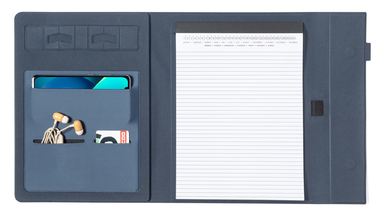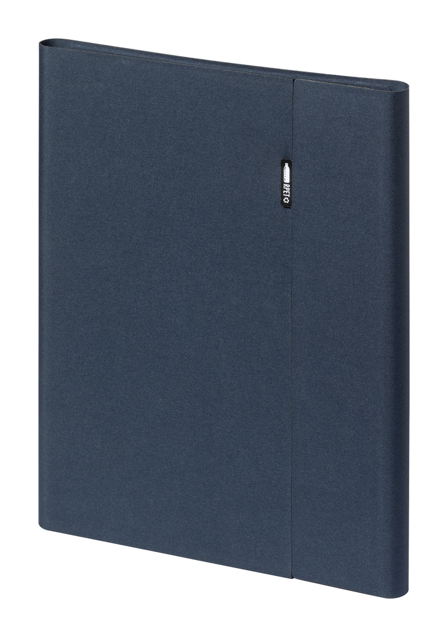 Dokumentenmappe aus 600D RPET-Polyester mit Magnetverschluss, faltbarem Handyhalter und Notizblock mit 20 Seiten (liniert). Mit RPET-Label. Größe A4.