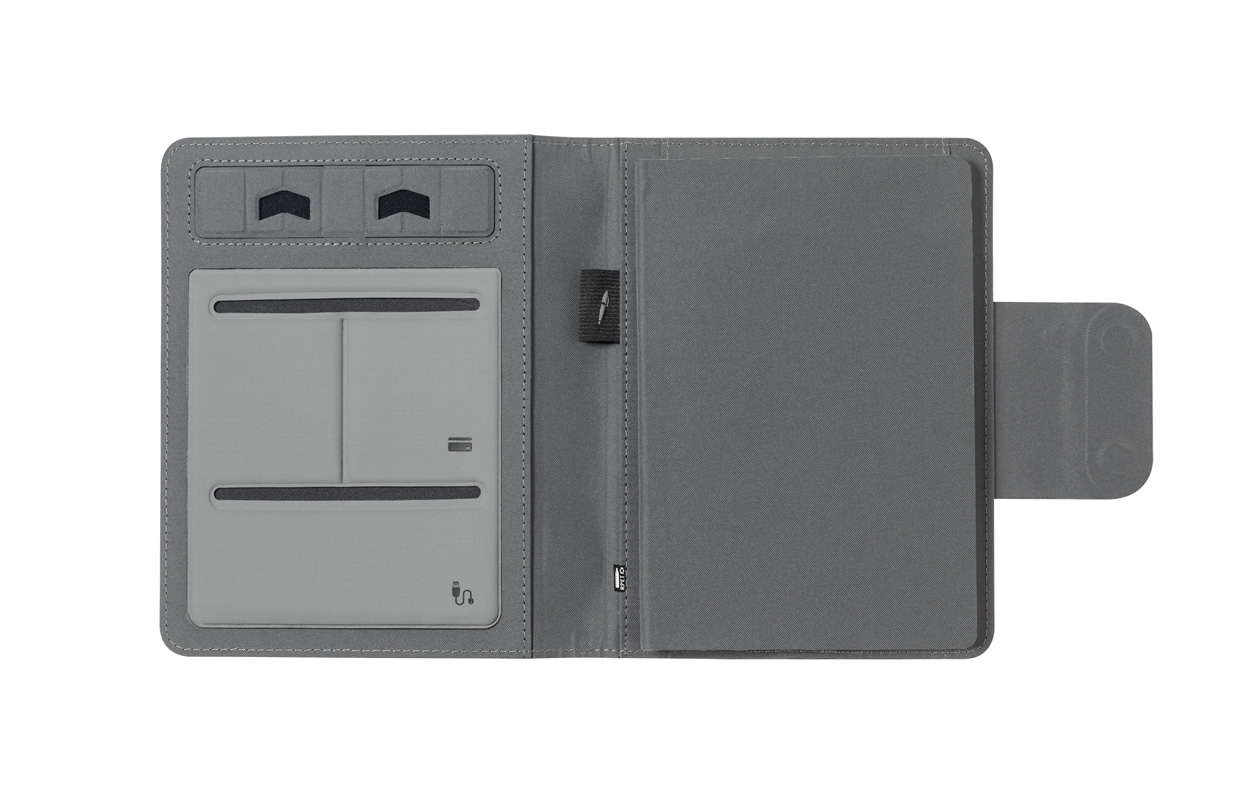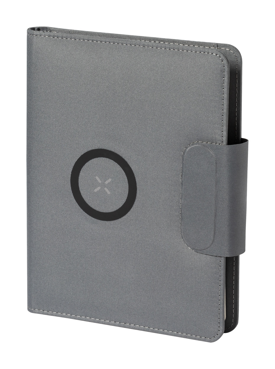 Dokumentenmappe aus 300D-RPET-Polyester mit Notizblock mit 65 Seiten (liniert), integriertem magnetischem Wireless-Fast-Charger (10 W), 5000-mAh-Powerbank mit USB-Ladeanschluss und faltbarem Handyhalter. Inklusive selbstklebendem Metallring zur Nutzung der Magnetfunktion an jedem kabellos aufladbaren Gerät. Inkl. USB-Ladekabel. Größe A5.