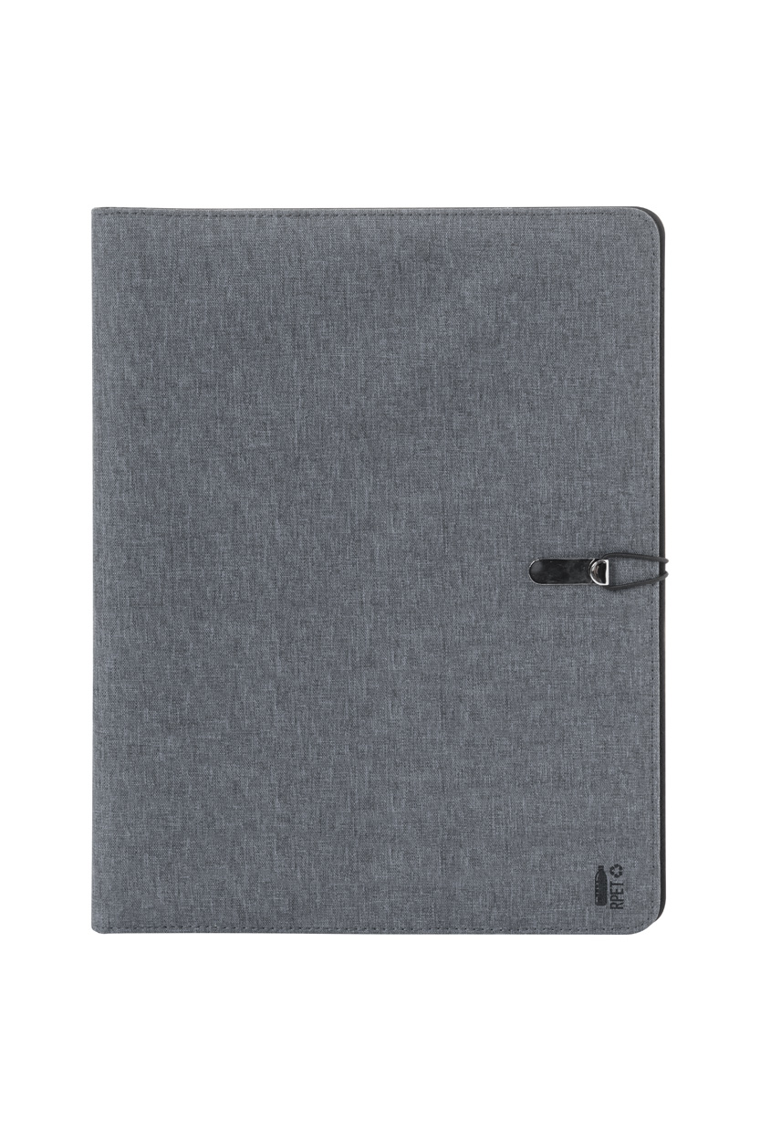 Dokumentenmappe aus 300D RPET-Polyester im A4-Format mit Notizblock mit 25 linierten Blättern und mehreren Organizer-Innentaschen.
