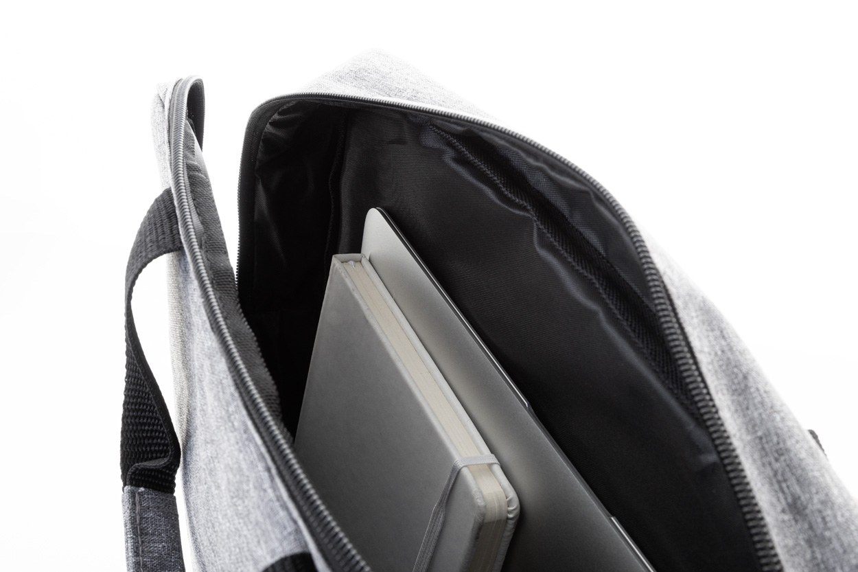 Wasserdichte, gepolsterte RPET-Dokumenten- und Laptoptasche mit Reißverschluss-Hauptfach, Reißverschluss-Vortasche und verstellbarem Schultergurt. Für Laptops bis zu 15" geeignet. Material: PU-beschichtetes 600D-RPET-Polyester. Mit RPET-Label.