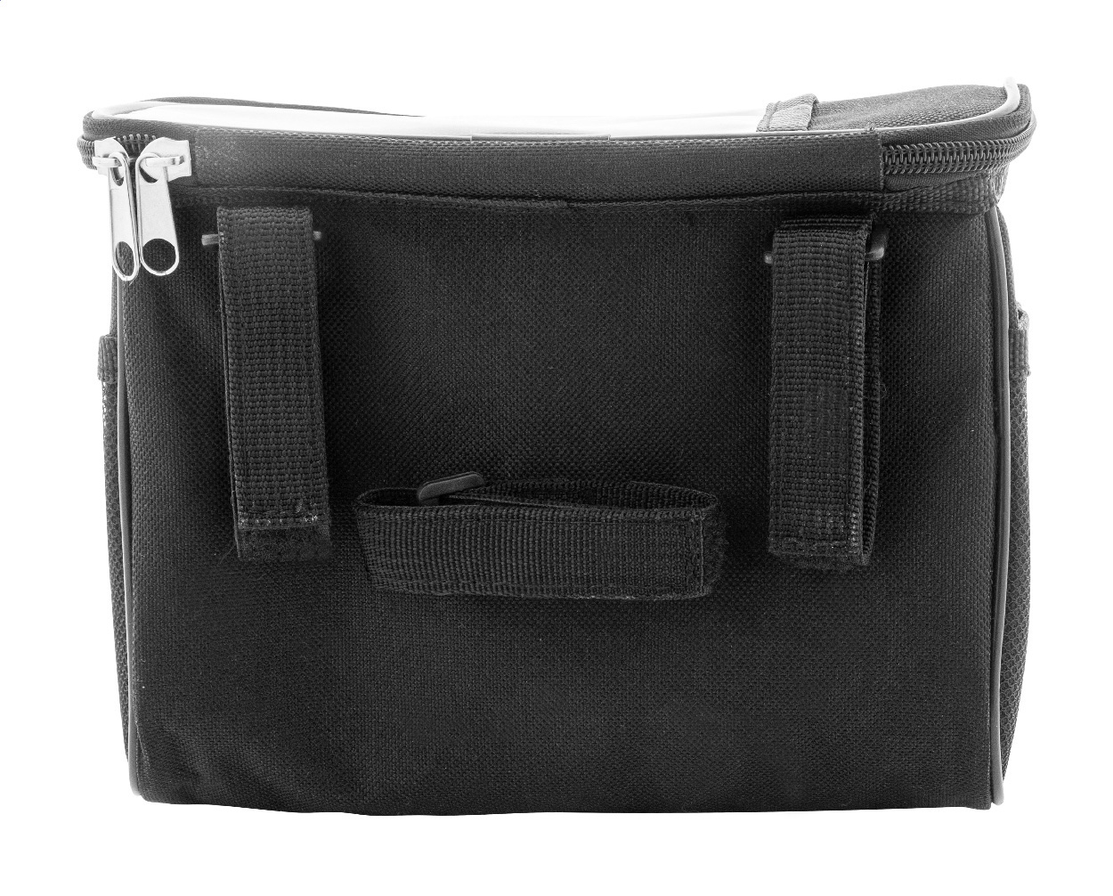 RPET-Fahrradlenkertasche mit Reißverschlussfach, Touchscreen-Handyhalterung, seitlichen Netztaschen, verstellbaren Klettverschlussriemen und reflektierendem Streifen. Material: 600D RPET-Polyester. Mit RPET-Label.