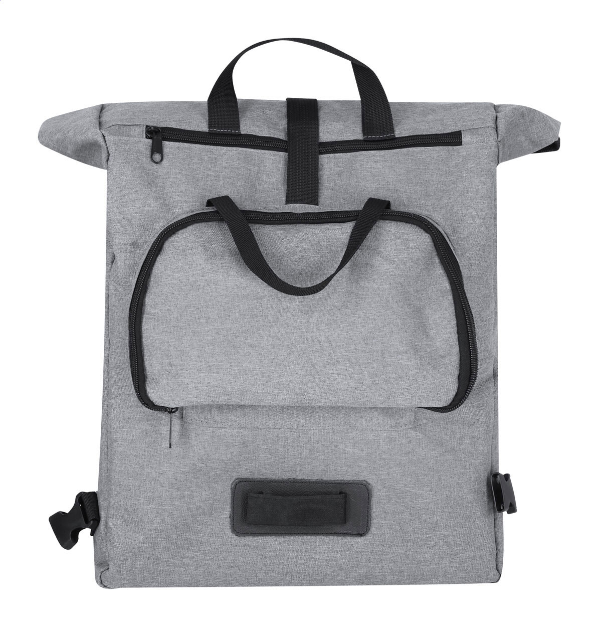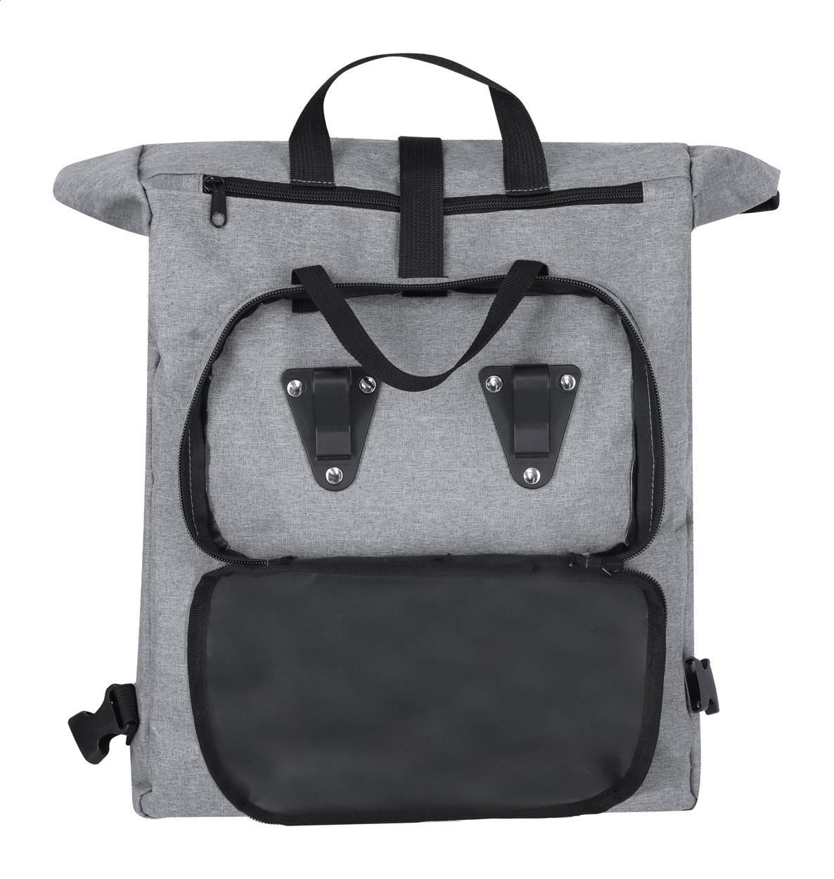 Fahrradrucksack aus 600D RPET-Polyester mit Reißverschlusstasche auf der Vorderseite und abnehmbaren gepolsterten Schultergurten. Mit versteckten Rahmenbefestigungsklammern.