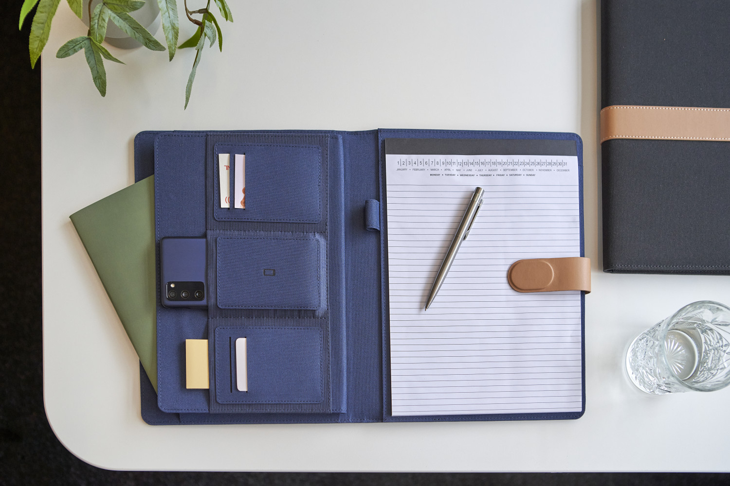 RPET-Faltmappe (ca. A4) mit PU-Detail auf dem Umschlag. Enthält ein Notizbuch mit 20 linierten Seiten (70 g / m²), mehreren Fächern, Stiftschlaufe und Magnetverschluss. Einzeln verpackt in einer Kraftpapier Hülle.
