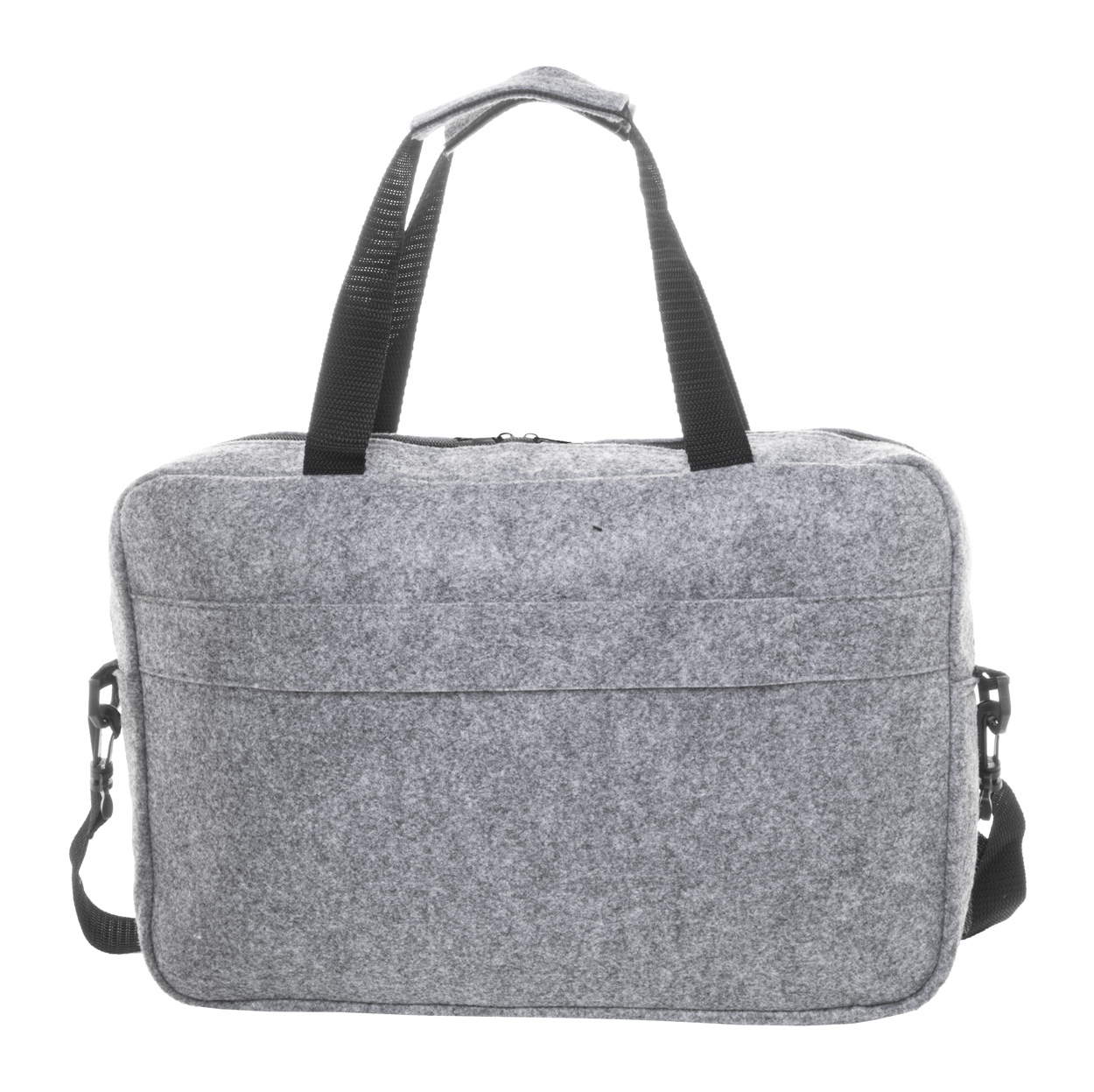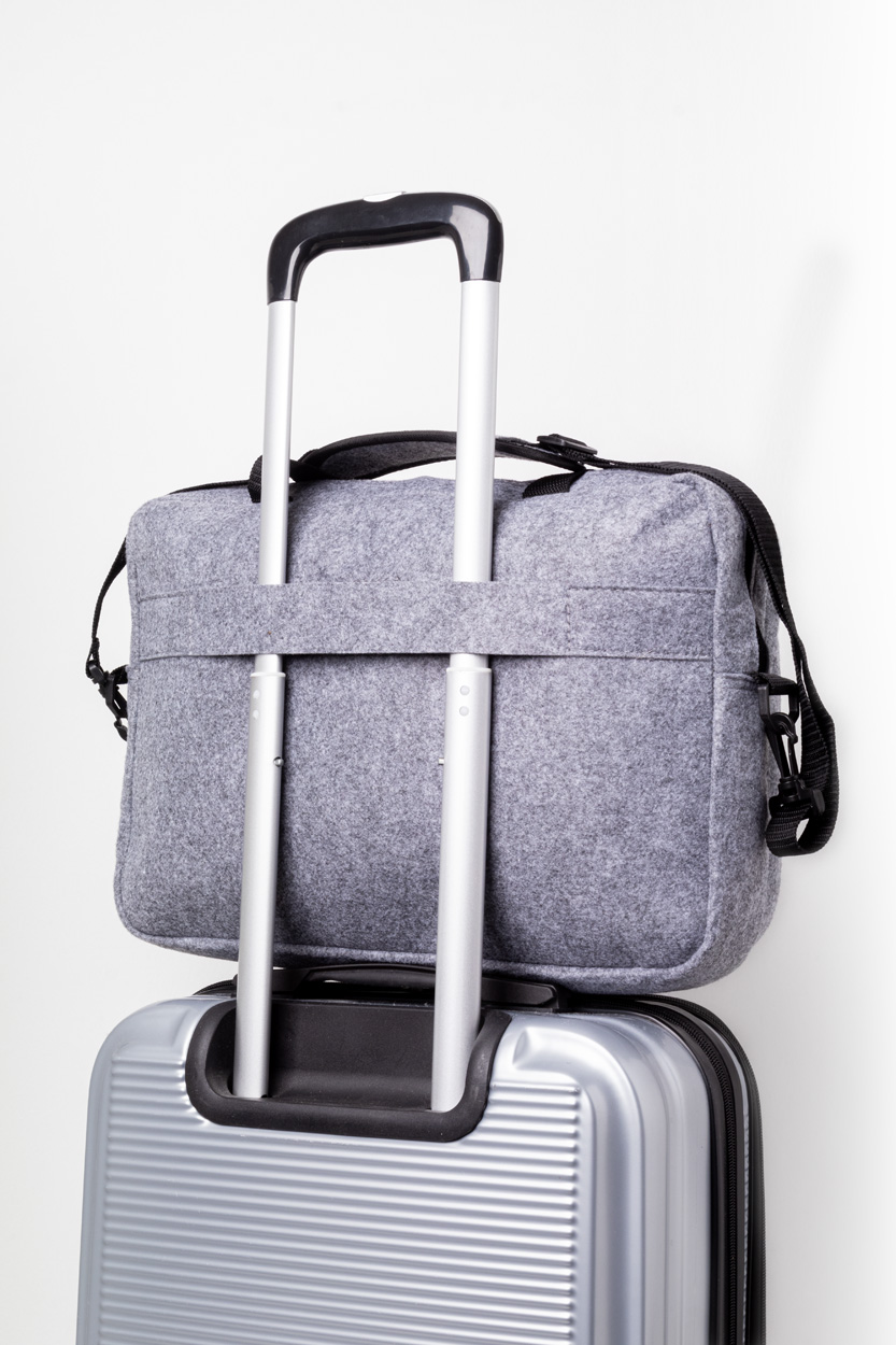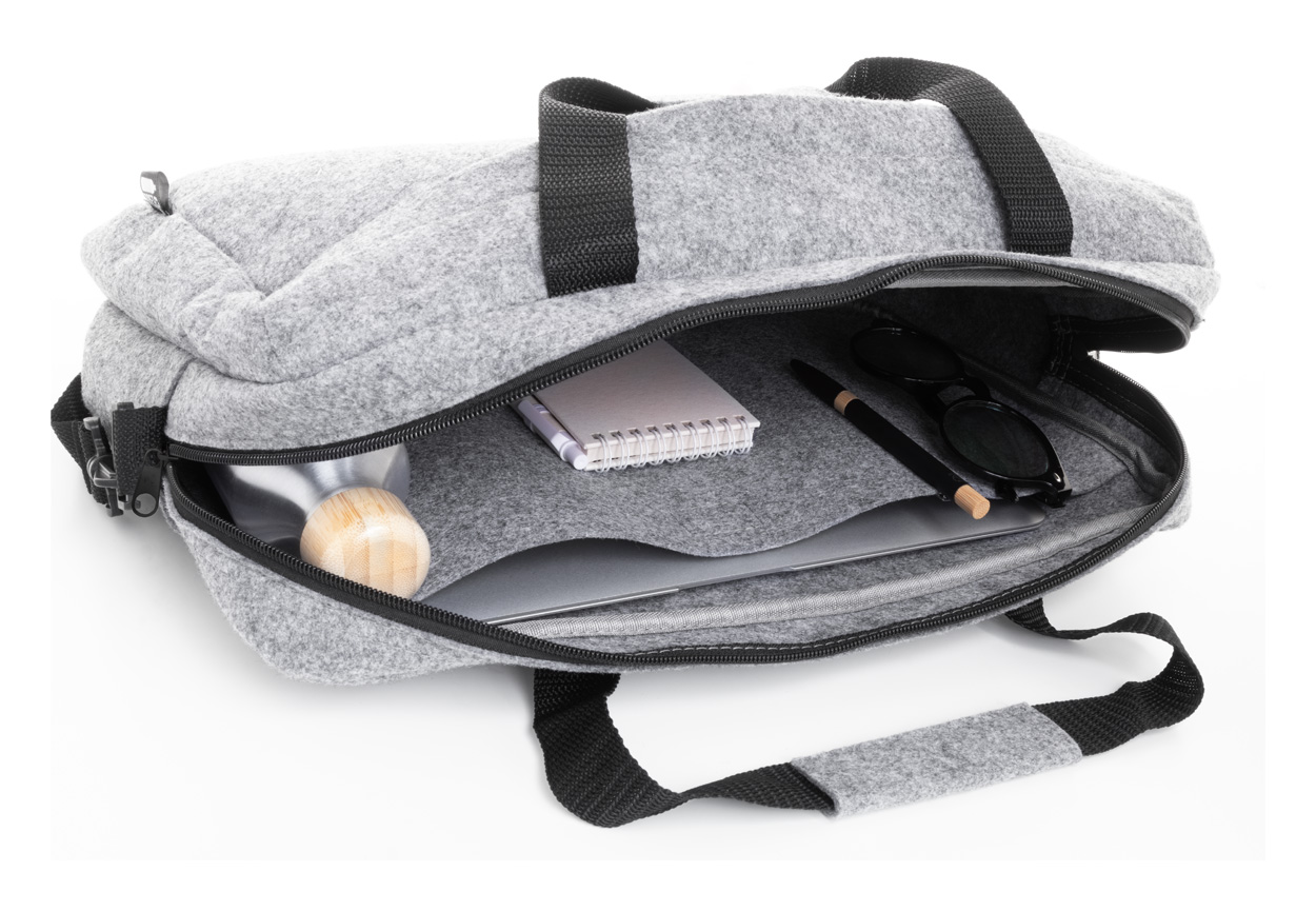 Dokumententasche aus RPET Filz mit Reißverschluss-Hauptfach, Fronttasche, Laptopfach (15"), Trolley-Befestigungsband und verstellbarem Schultergurt. Mit RPET-Label.