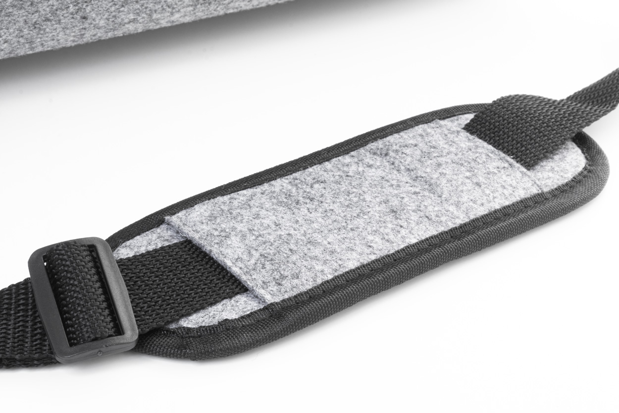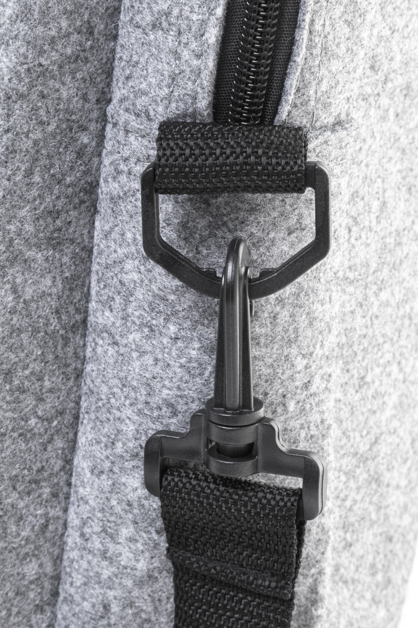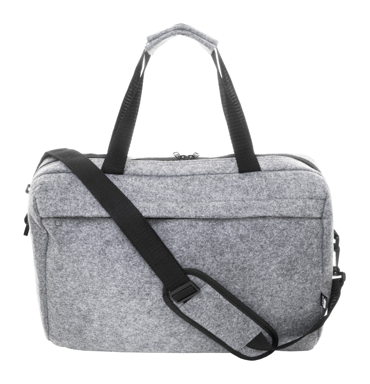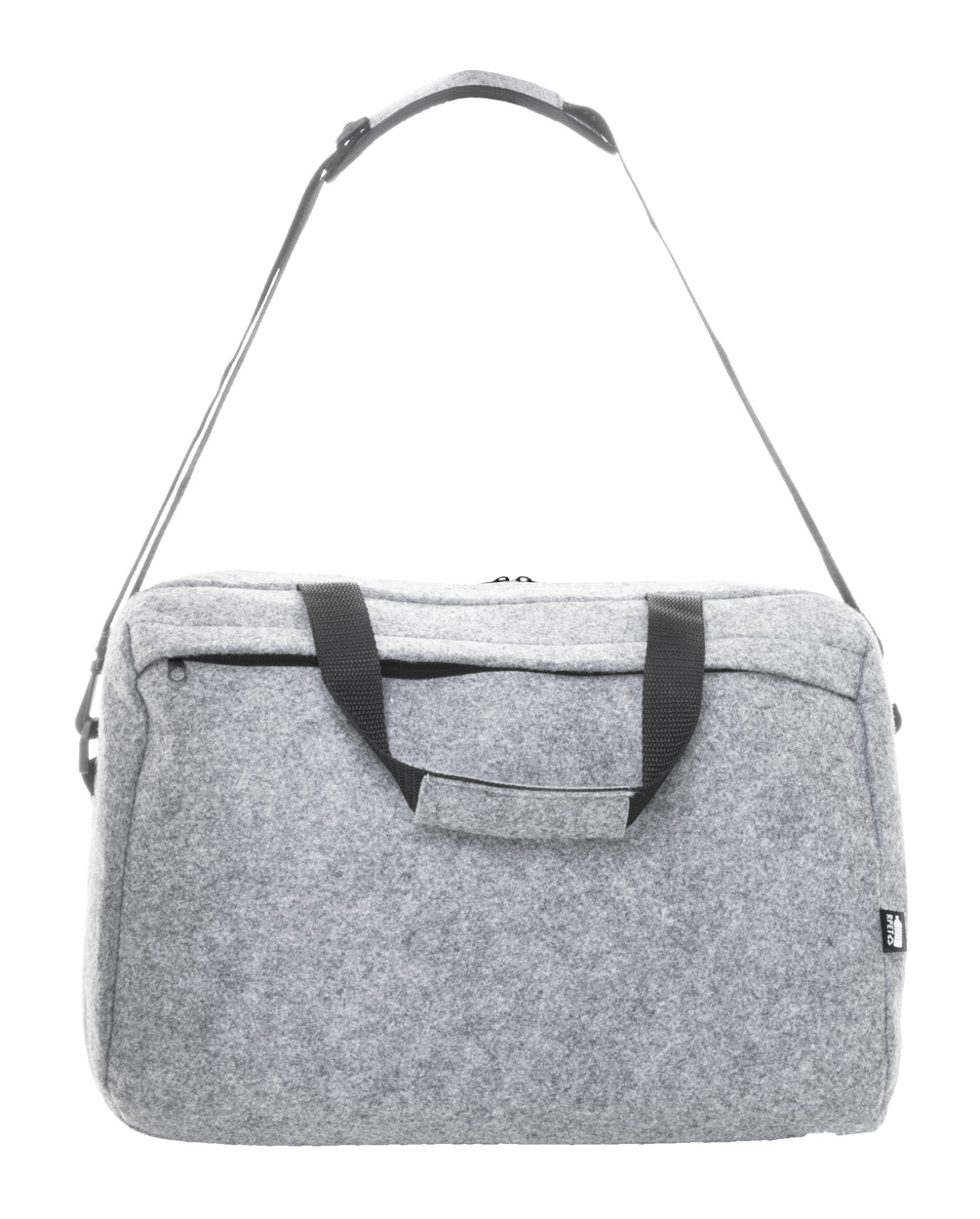 Dokumententasche aus RPET Filz mit Reißverschluss-Hauptfach, Fronttasche, Laptopfach (15"), Trolley-Befestigungsband und verstellbarem Schultergurt. Mit RPET-Label.