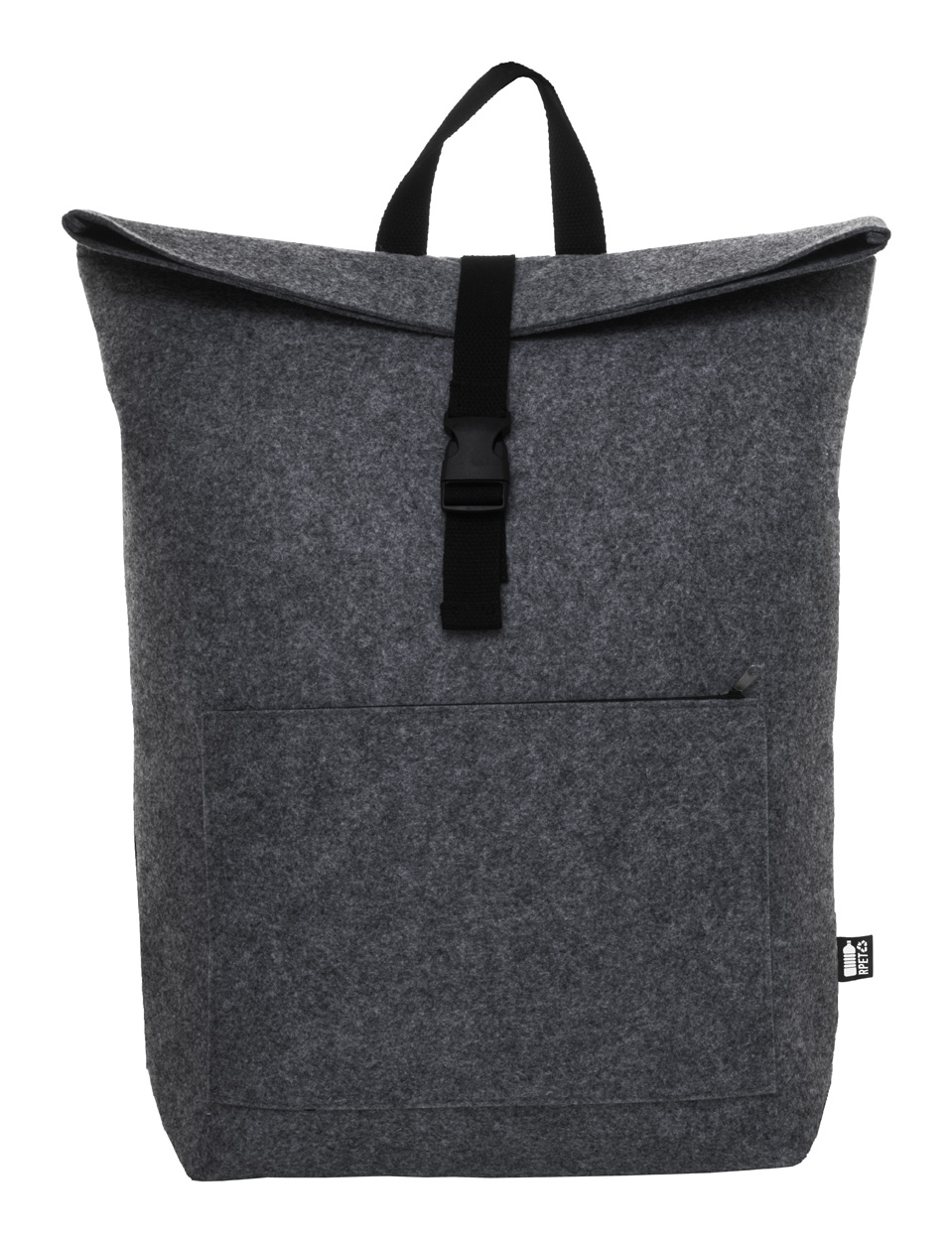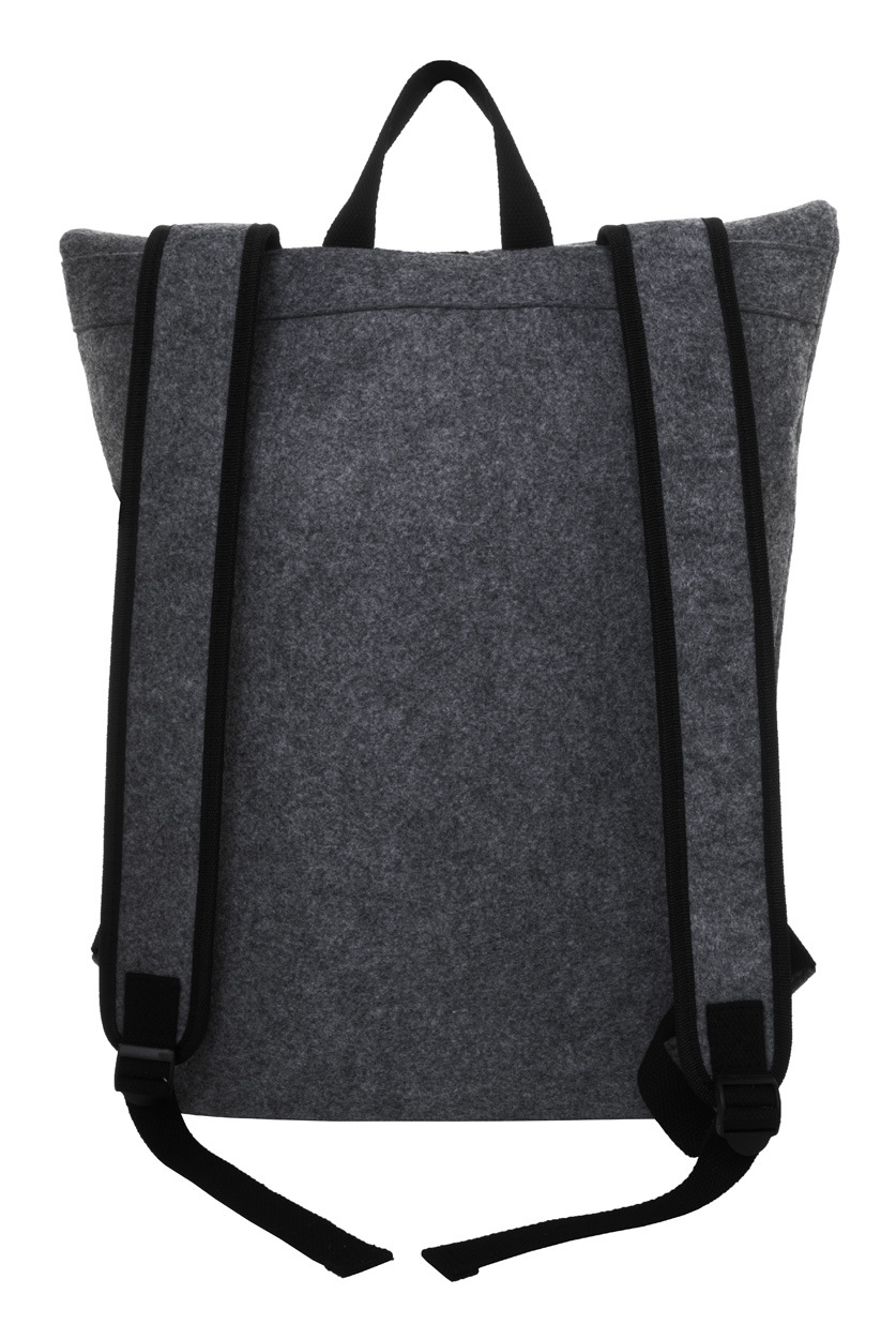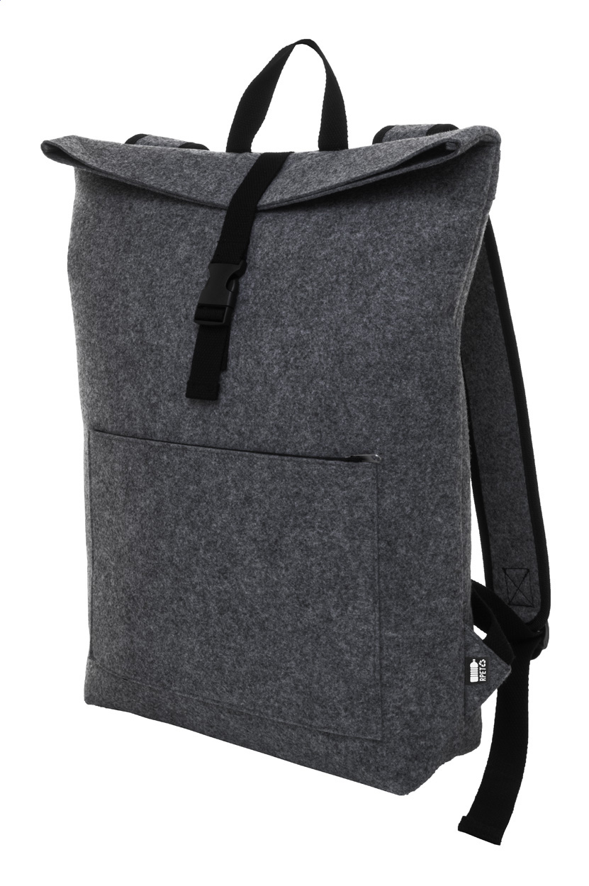 Rolltop-Rucksack aus RPET Filz mit Schnallenverschluss am Hauptfach, Reißverschluss-Fronttasche, Laptopfach (15") und gepolsterten Schultergurten. Mit RPET-Label.