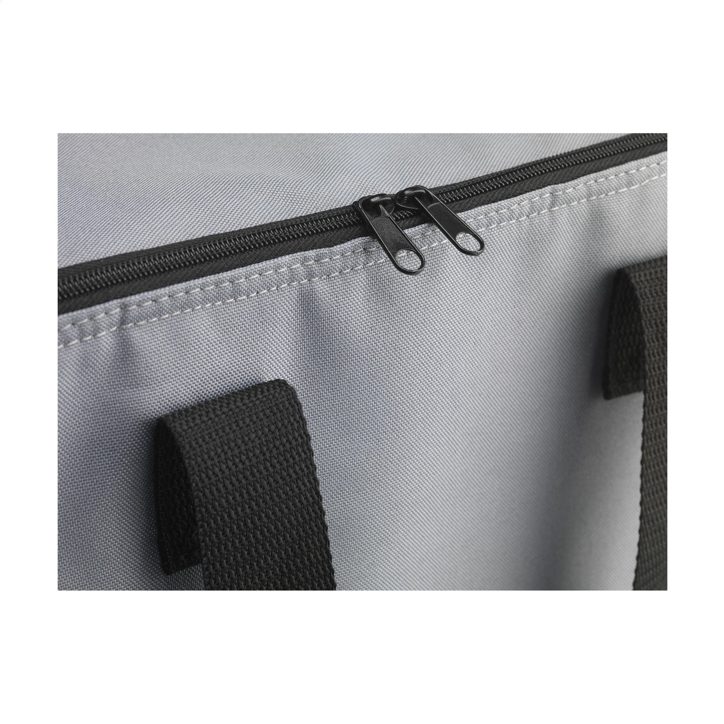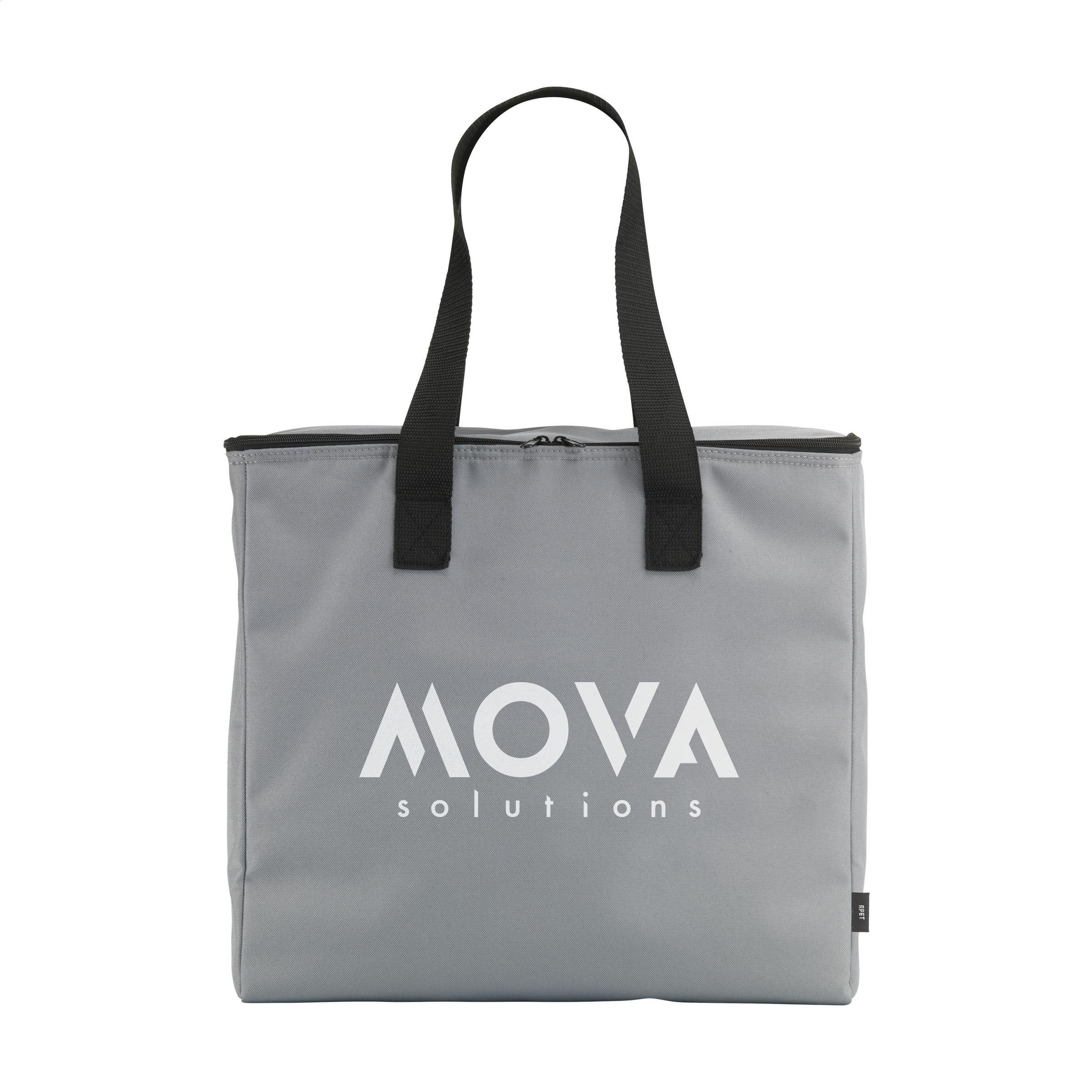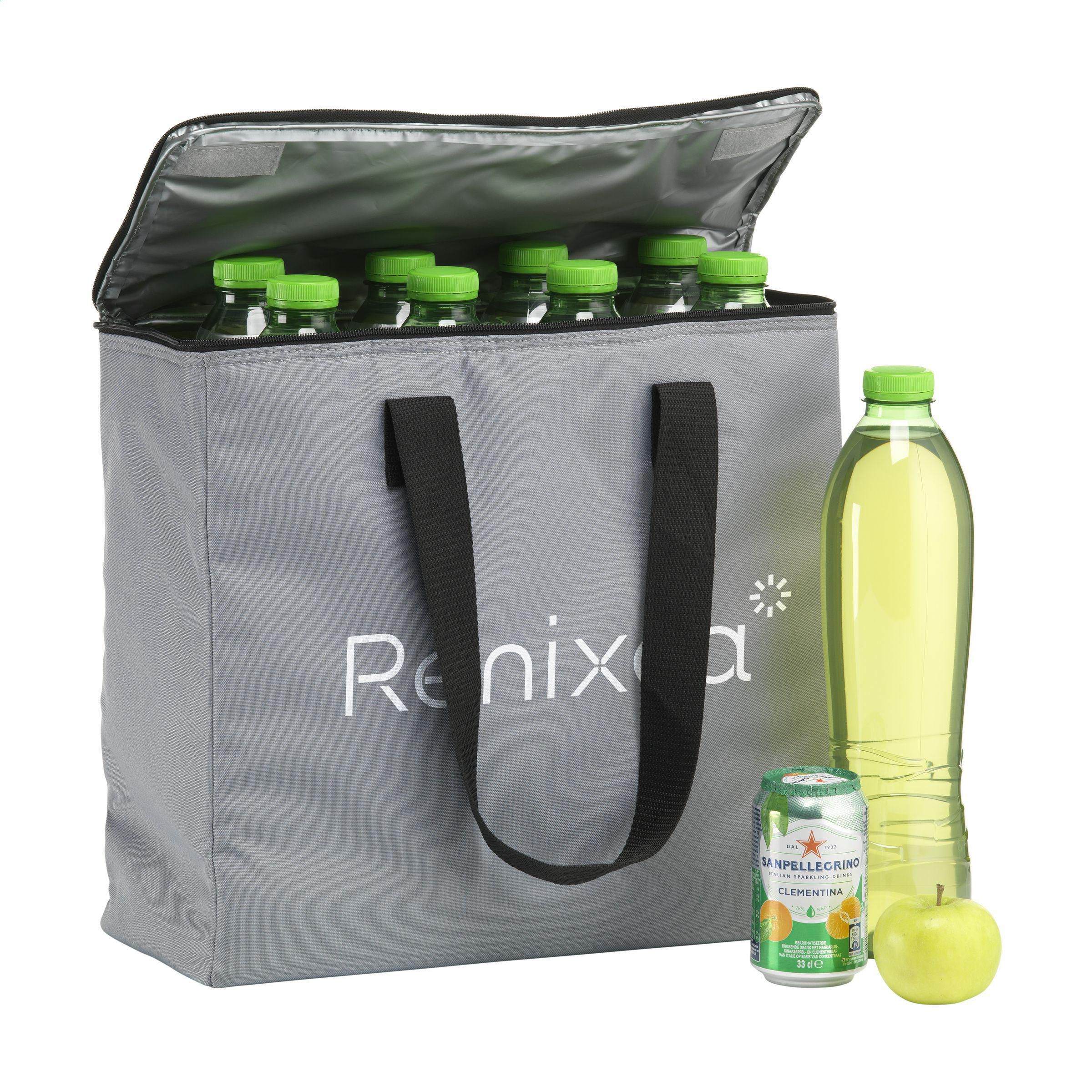 Große, stabile Kühltasche mit Reißverschluss und Tragegriffen. Dieses Produkt wird aus 600D-RPET-Polyester hergestellt, einem Material aus recycelten PET-Flaschen und Textilfasern. Diese Tasche bietet viel Stauraum und kann bis zu acht 1,5-Liter-Flaschen fassen. Diese Tasche kann auch zum Transportieren von Zwei-Liter-Flaschen verwendet werden. Fassungsvermögen ca. 24 Liter.