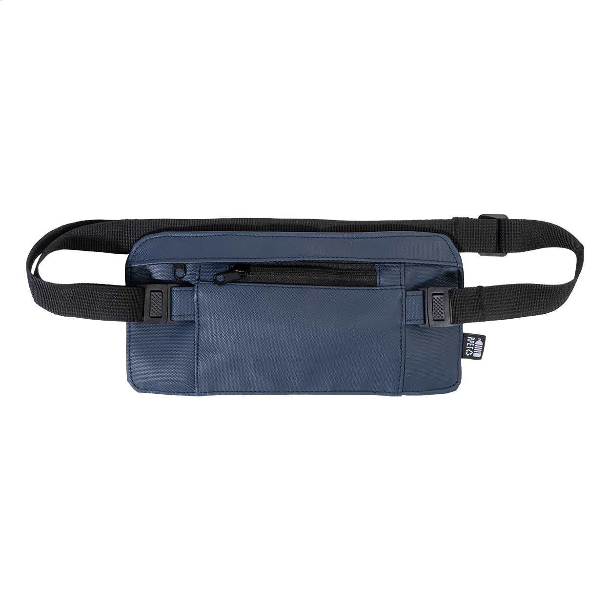 Schmale RPET-Gürteltasche mit PU-beschichteter Vorderseite, Reißverschlussfach, Vordertasche und verstellbarem Gurt. Material: 600D RPET-Polyester, PU beschichtet. Mit Label RPET.