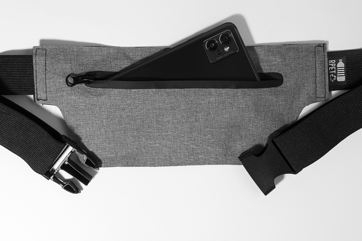 Schlanke Gürteltasche aus RPET mit Reißverschlussfach und verstellbarem Elastikband. Material: 300D RPET Polyester. Mit Label RPET.