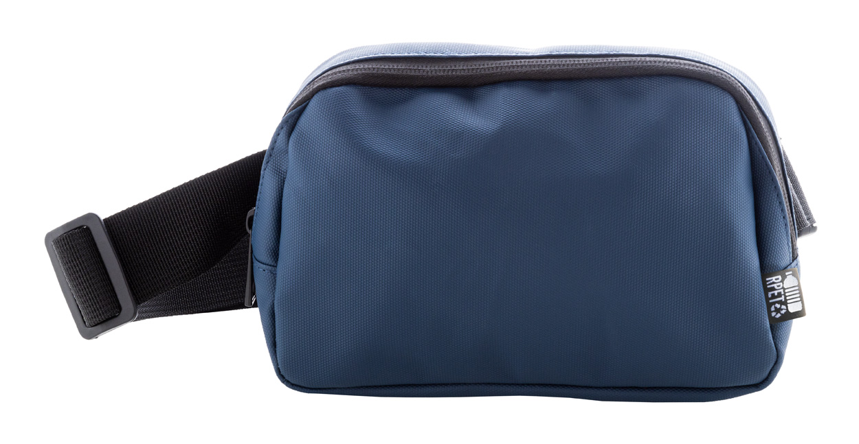 Wasserdichte RPET-Hüfttasche mit 2 Reißverschlussfächern, Netz-Innentaschen und verstellbarem Gurt. Material: PU-beschichtetes 600D RPET-Polyester. Mit RPET-Label.