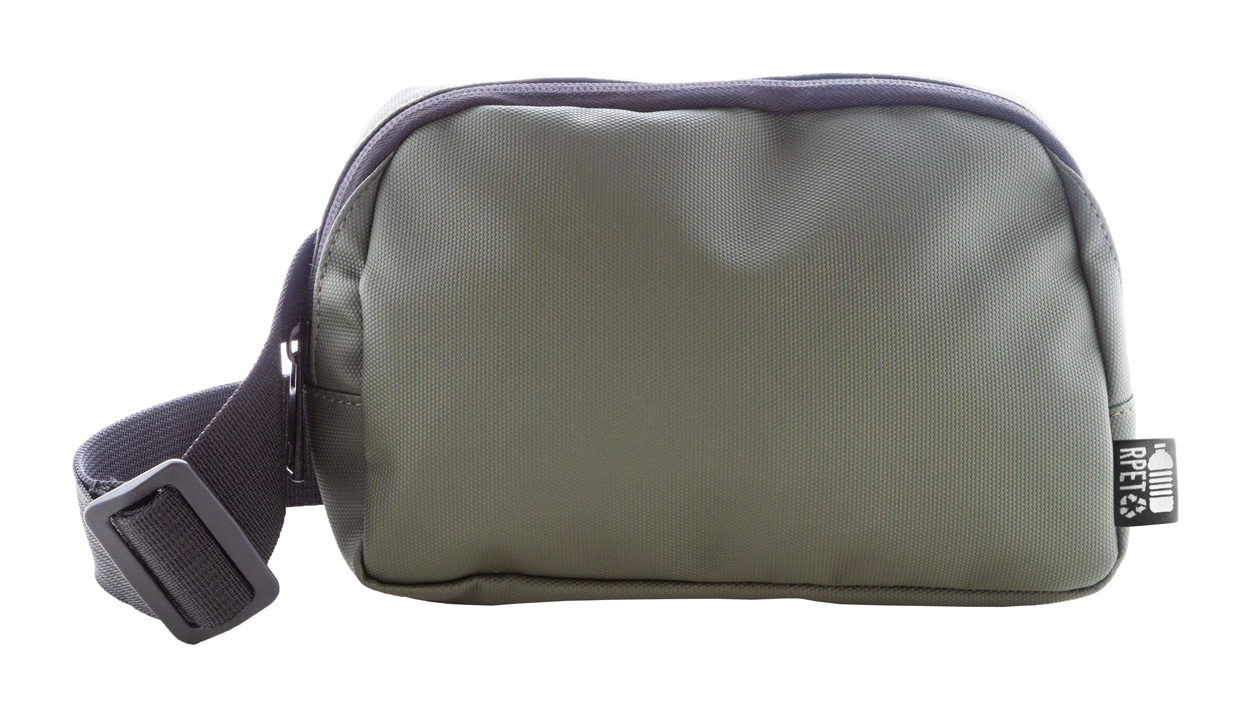 Wasserdichte RPET-Hüfttasche mit 2 Reißverschlussfächern, Netz-Innentaschen und verstellbarem Gurt. Material: PU-beschichtetes 600D RPET-Polyester. Mit RPET-Label.