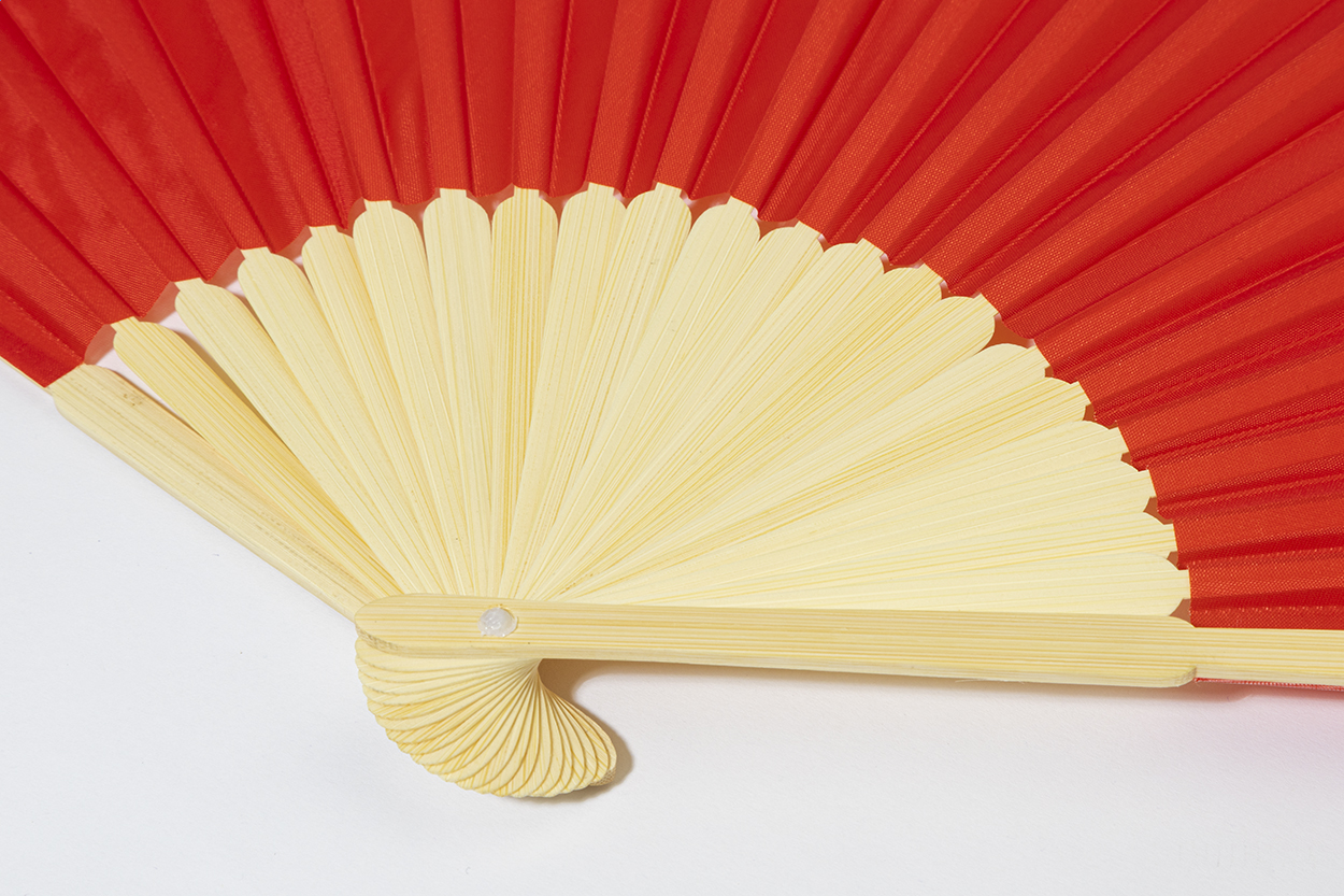 Handfächer aus RPET-Polyester mit Bambusspeichen.
