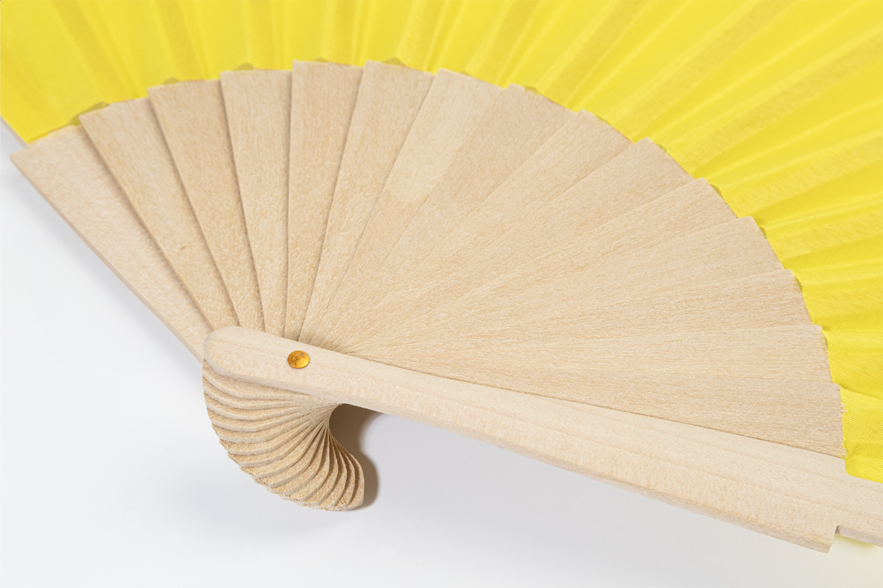 Handfächer aus RPET-Polyester mit Holzspeichen.