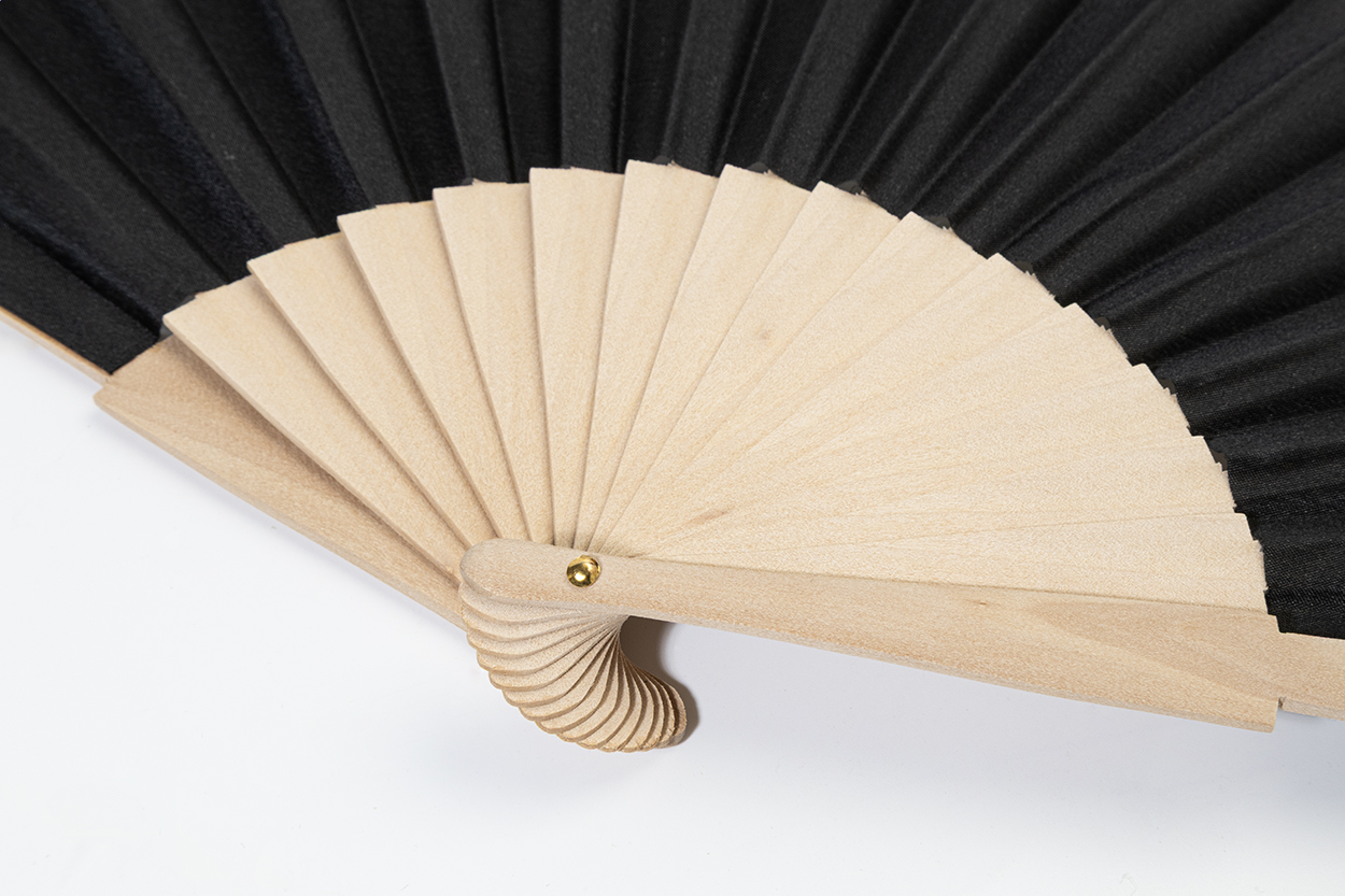 Handfächer aus RPET-Polyester mit Holzspeichen.
