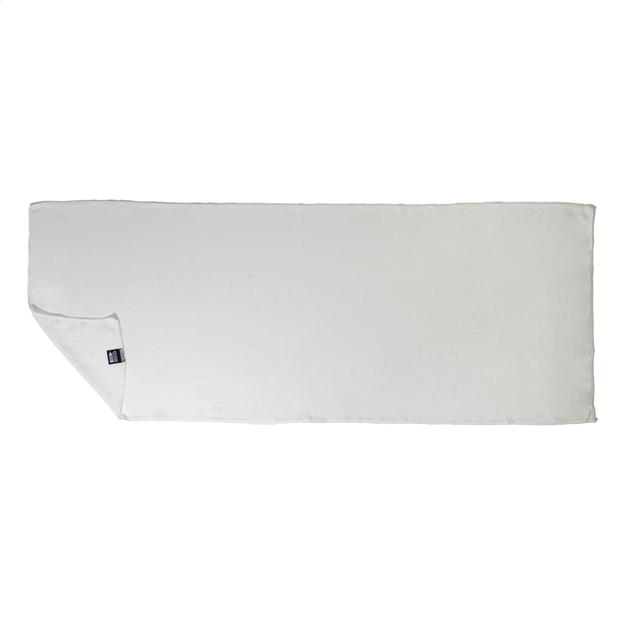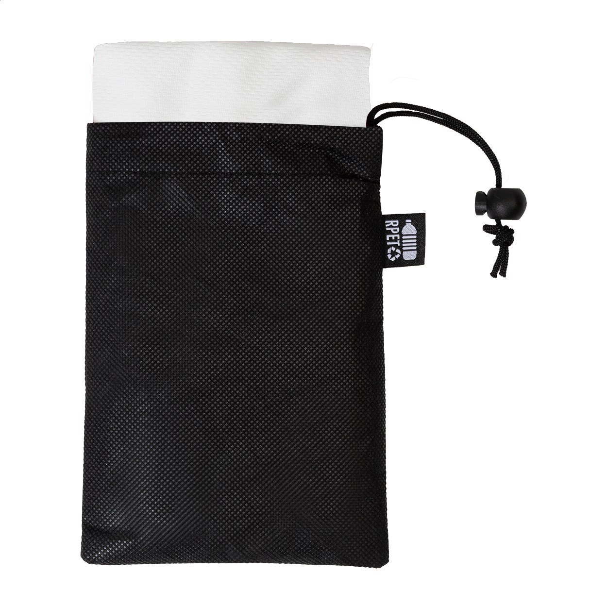 Sporthandtuch aus RPET-Mikrofaser in RPET-Vliestasche. Material: RPET-Polyester (140 g / m²). Mit Label RPET.