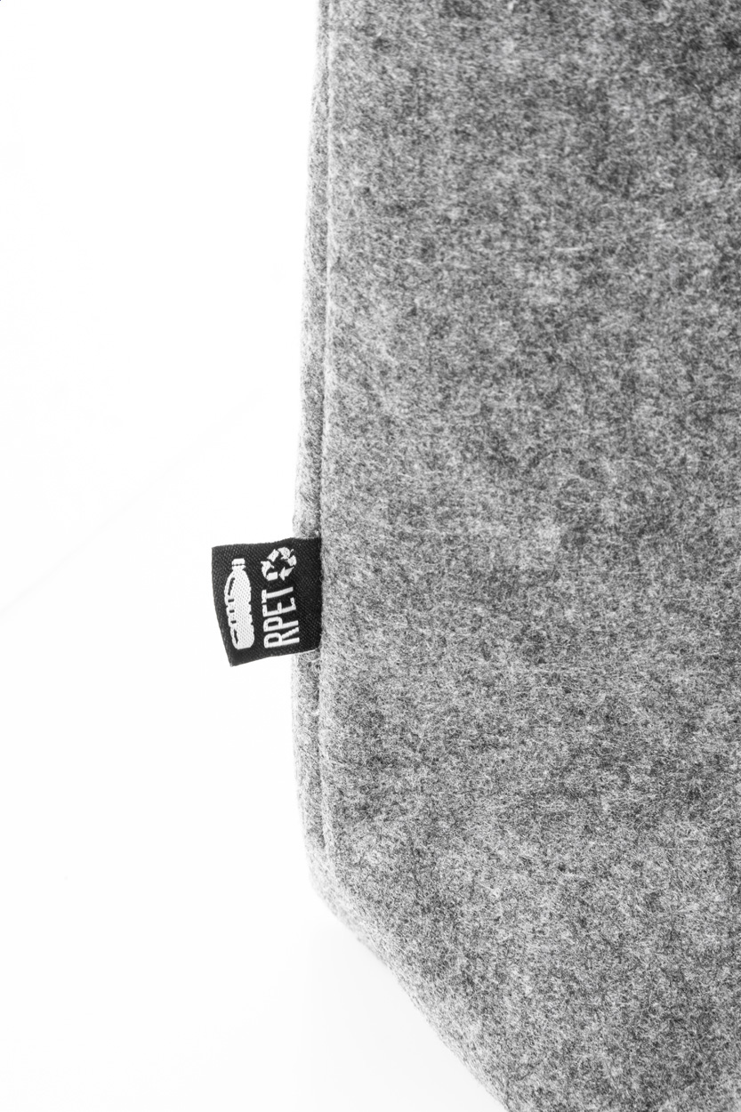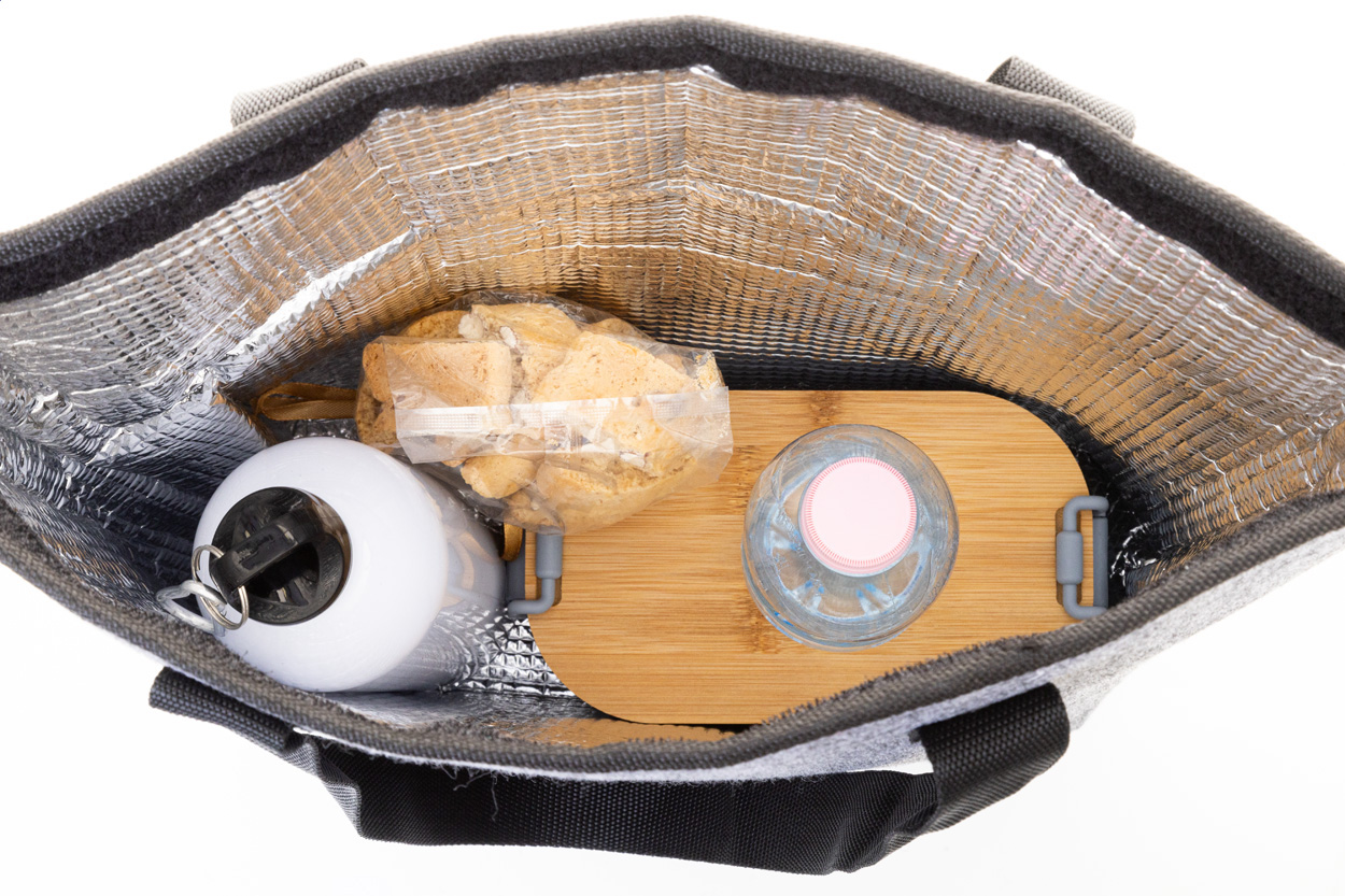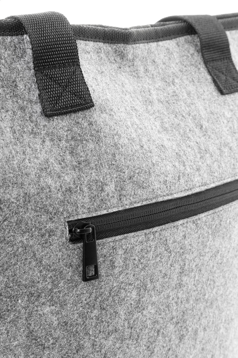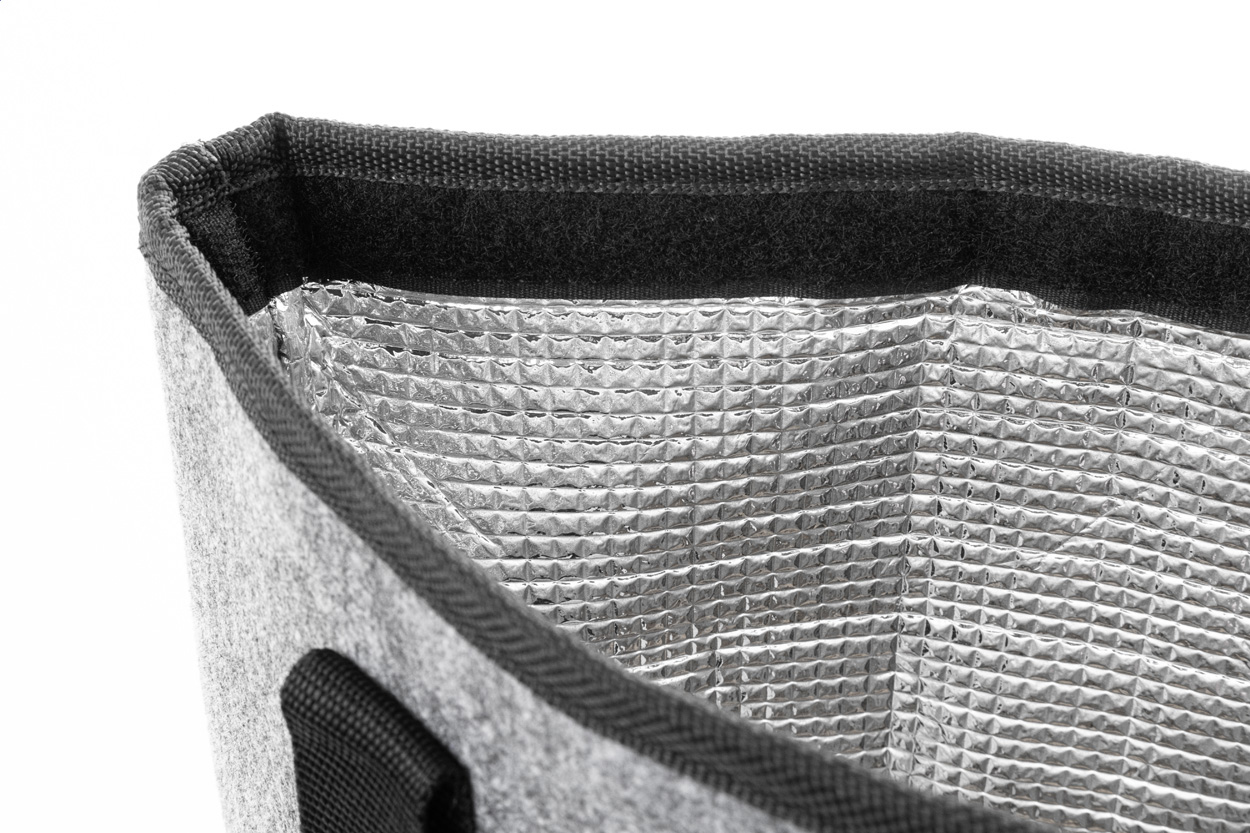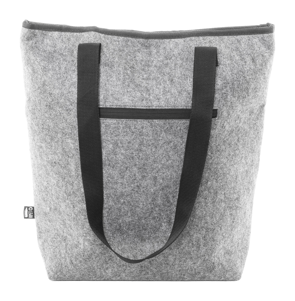 Einkaufs-Kühltasche aus RPET-Filz mit Aluminium-Polsterung. Mit Klettverschluss, Reißverschlusstasche vorne und langen Griffen. Mit RPET-Label.