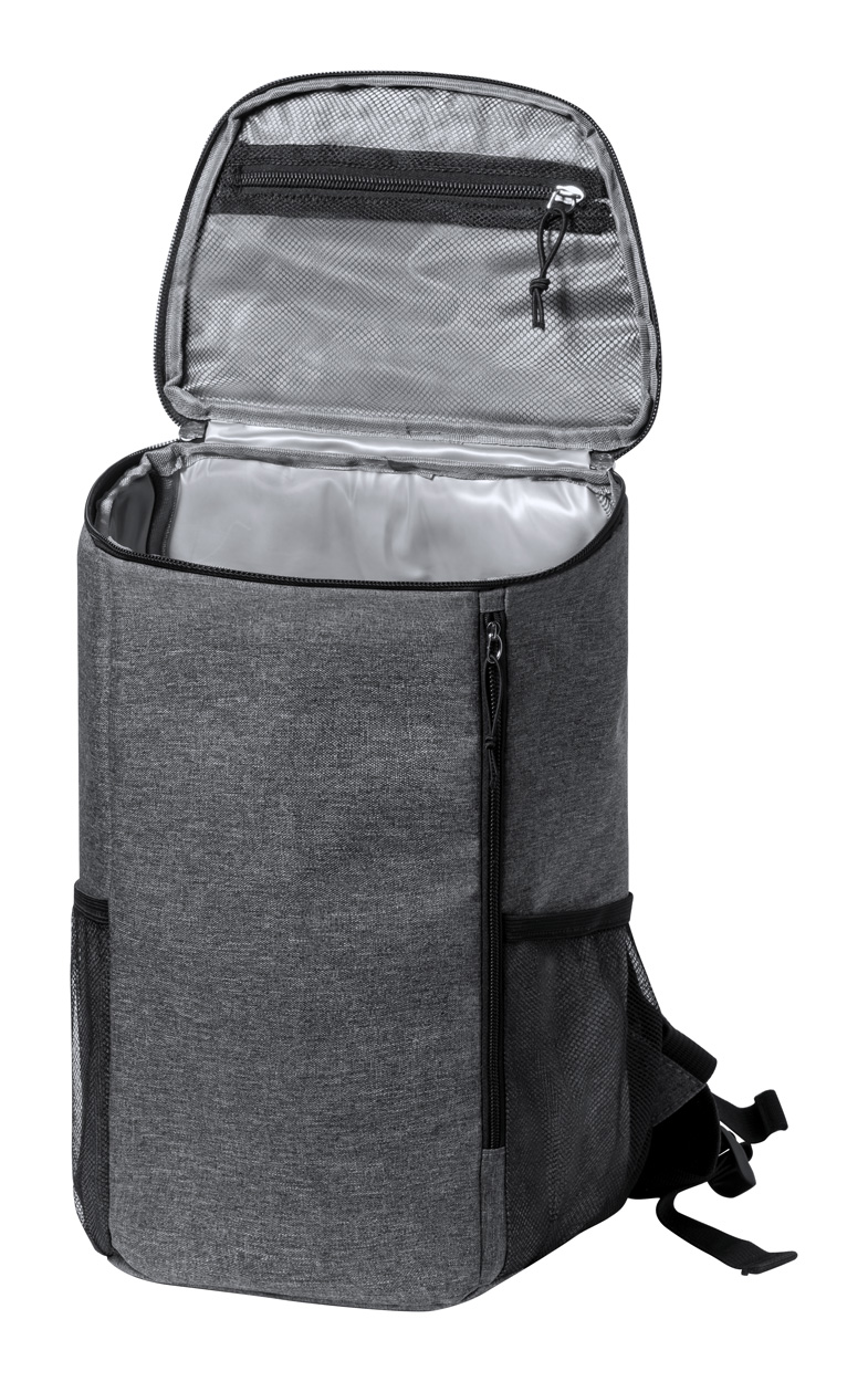 Kühlrucksack aus RPET mit Hauptfach mit Reißverschluss und PEVA-Polsterung, seitlichen Netztaschen und gepolsterten Schultergurten. Mit RPET-Label. Material: 600D RPET-Polyester.