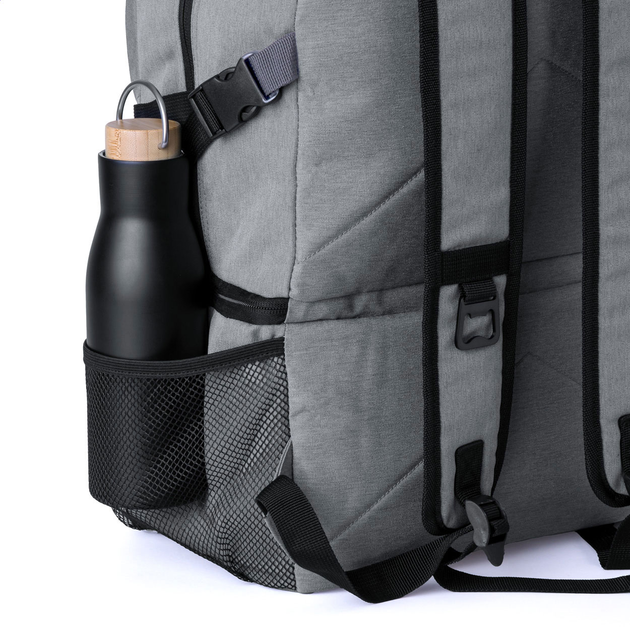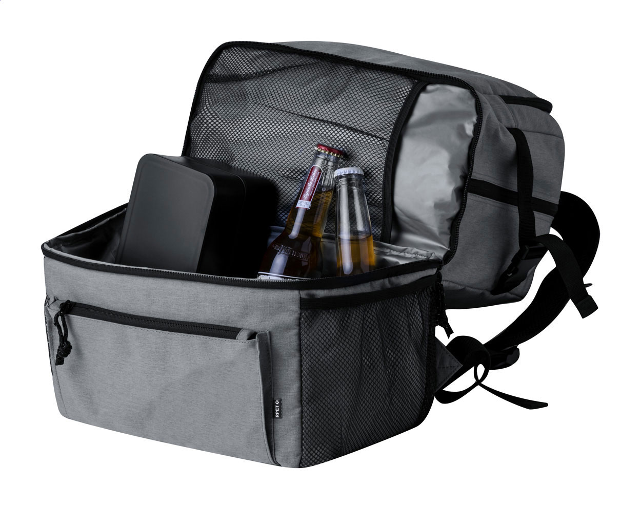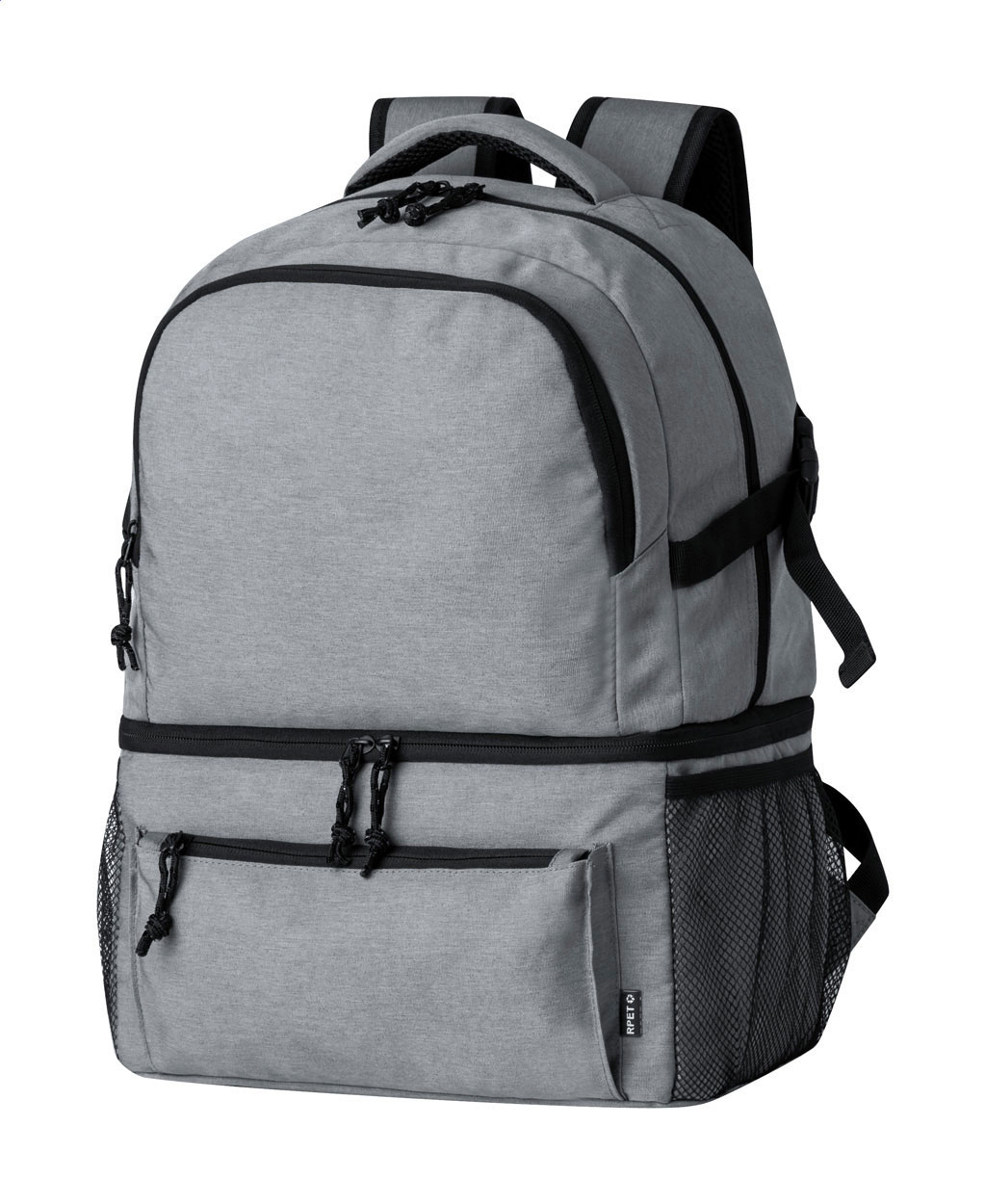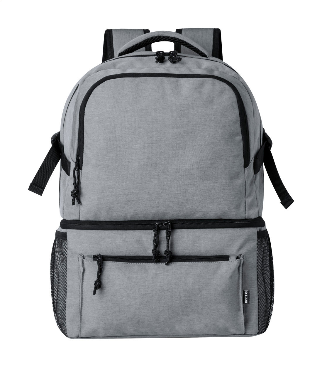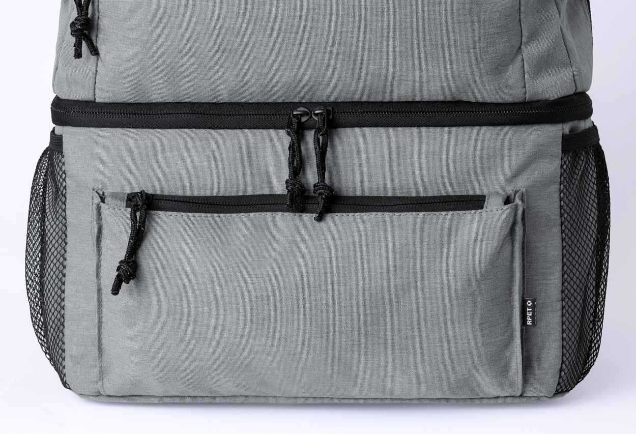 RPET-Rucksack mit PEVA-gepolstertem Kühlfach, Reißverschlusstaschen, Mesh-Seitentaschen, gepolstertem Rücken und Schultergurten. Material: 600D RPET-Polyester. Mit RPET-Label.