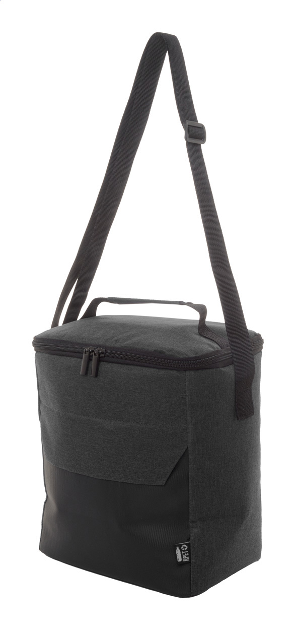 Kühltasche mit Reißverschluss aus RPET mit PU-beschichteten Applikationen und PEVA-Polsterung. Mit Tragegriff, verstellbarem Schultergurt und kleiner Vordertasche. Material: 600D RPET-Polyester. Mit RPET-Label.