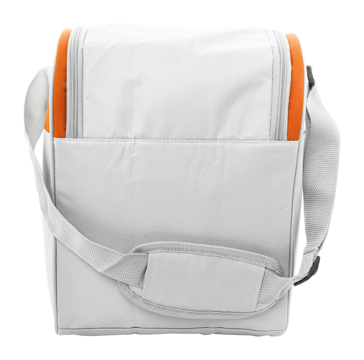 RPET-Kühltasche mit Aluminium-Polsterung. Mit 2 Reißverschlussfächern, kleiner Fronttasche und verstellbarem Schultergurt. Material: 600D RPET-Polyester. Mit RPET-Label.