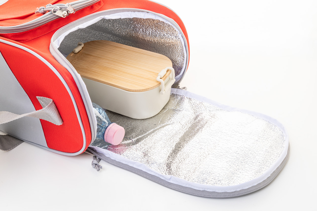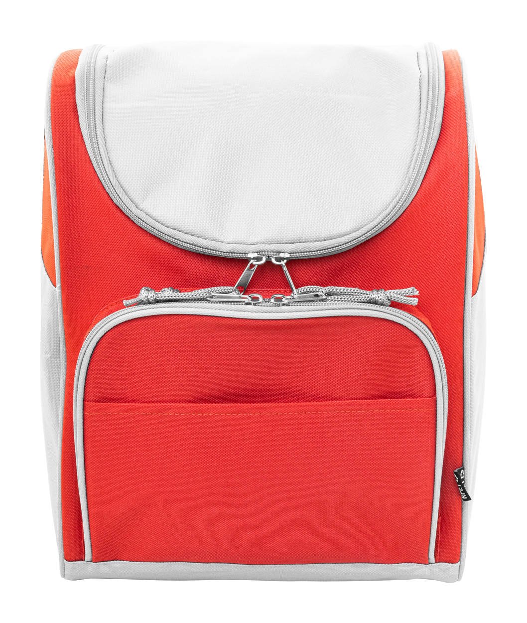 RPET-Kühltasche mit Aluminium-Polsterung. Mit 2 Reißverschlussfächern, kleiner Fronttasche und verstellbarem Schultergurt. Material: 600D RPET-Polyester. Mit RPET-Label.