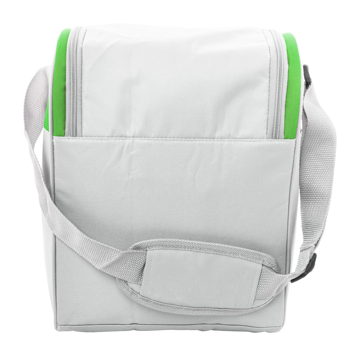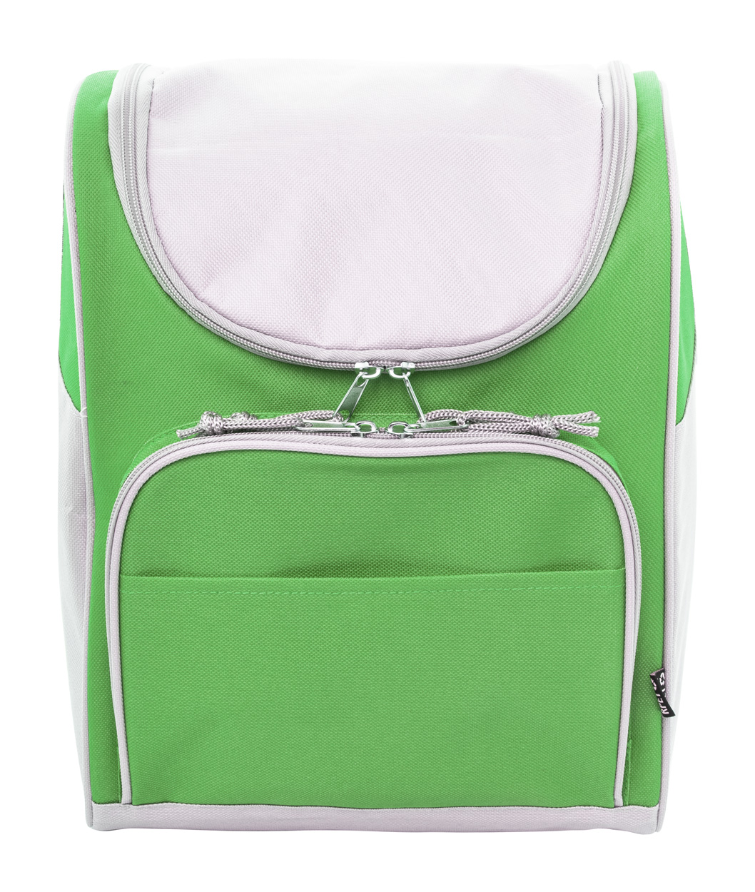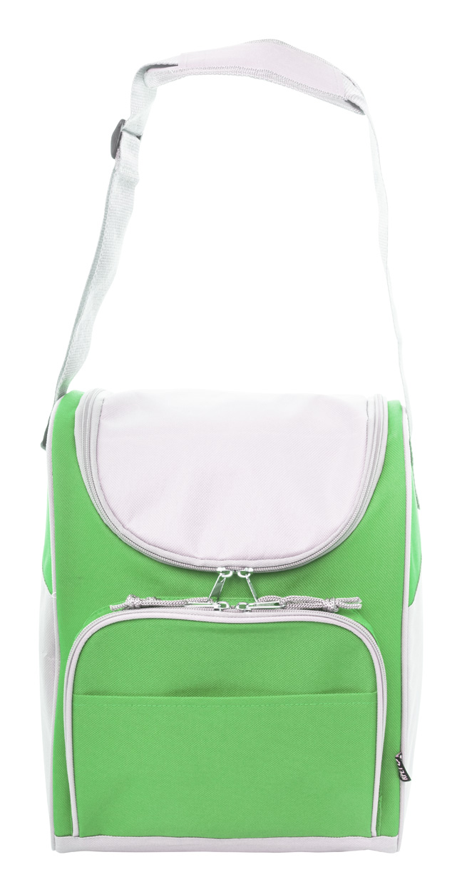 RPET-Kühltasche mit Aluminium-Polsterung. Mit 2 Reißverschlussfächern, kleiner Fronttasche und verstellbarem Schultergurt. Material: 600D RPET-Polyester. Mit RPET-Label.