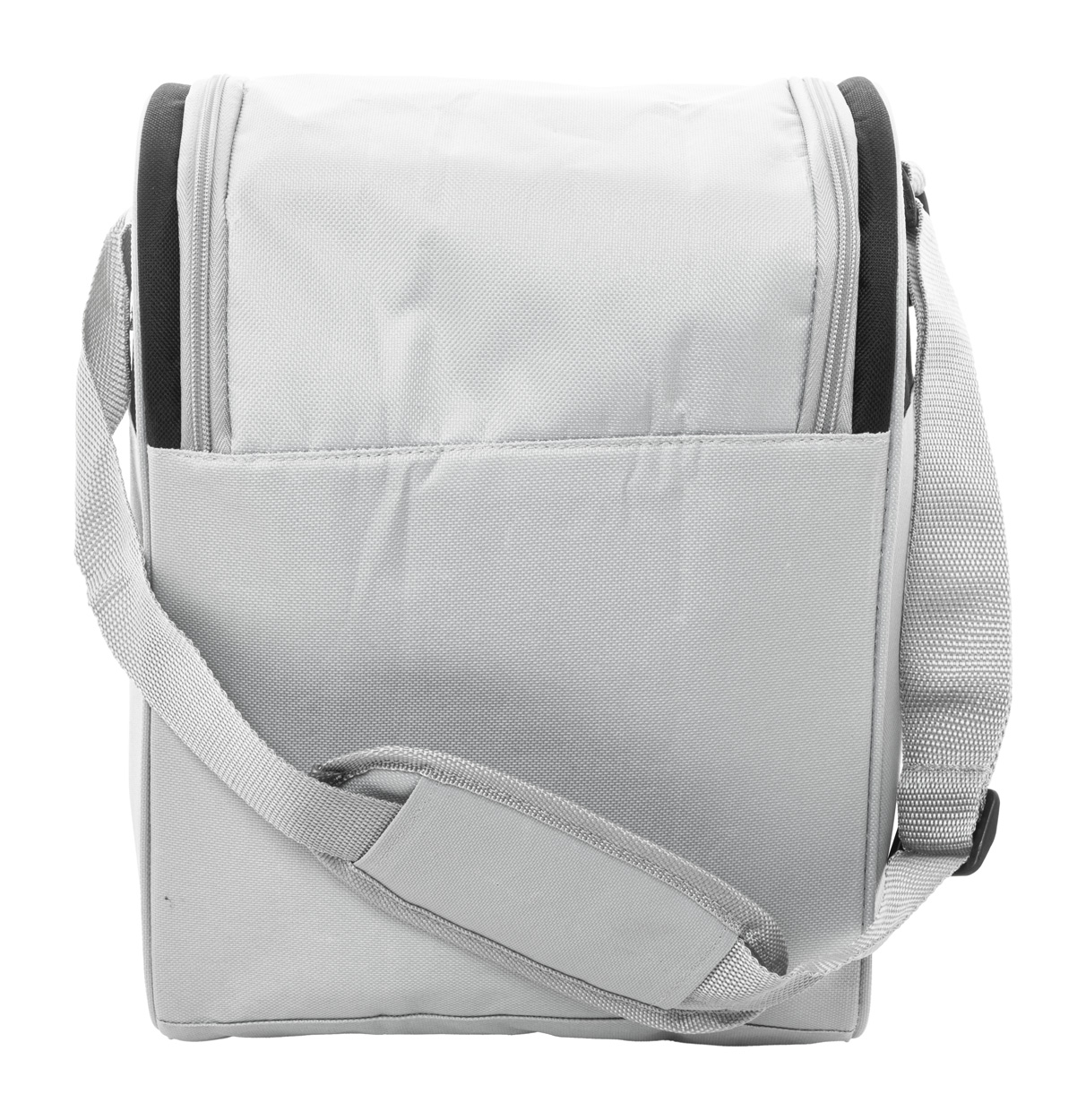 RPET-Kühltasche mit Aluminium-Polsterung. Mit 2 Reißverschlussfächern, kleiner Fronttasche und verstellbarem Schultergurt. Material: 600D RPET-Polyester. Mit RPET-Label.