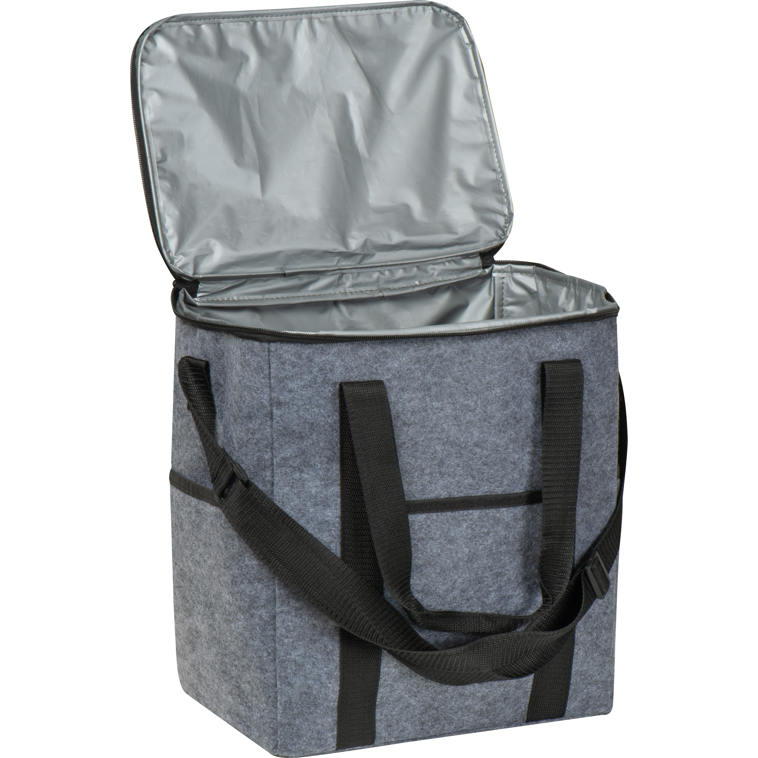 Extra große Kühltasche aus recyceltem Filz. Sie hat ein großes Innenfach, drei Einsteckfächer außen sowie zwei Tragegriffe und einen verstellbaren Schultergurt. Ihre Werbung drucken wir auf den Deckel.