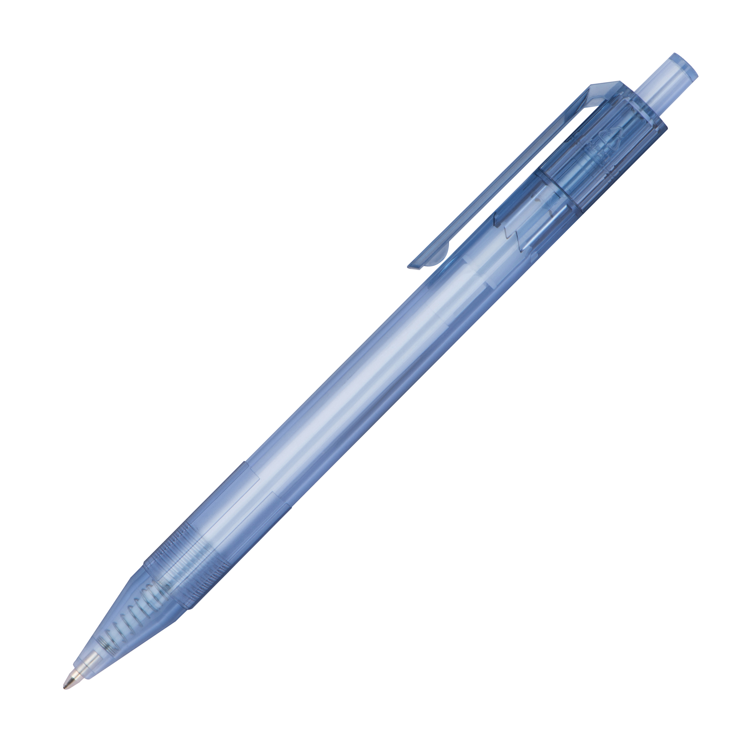 Transparenter Kugelschreiber aus recyceltem PET mit blauschreibender Großraummine, geradem Clip, Druckmechanismus und RPET Logo. Ihr Logo wird unterhalb vom Clip gedruckt.
