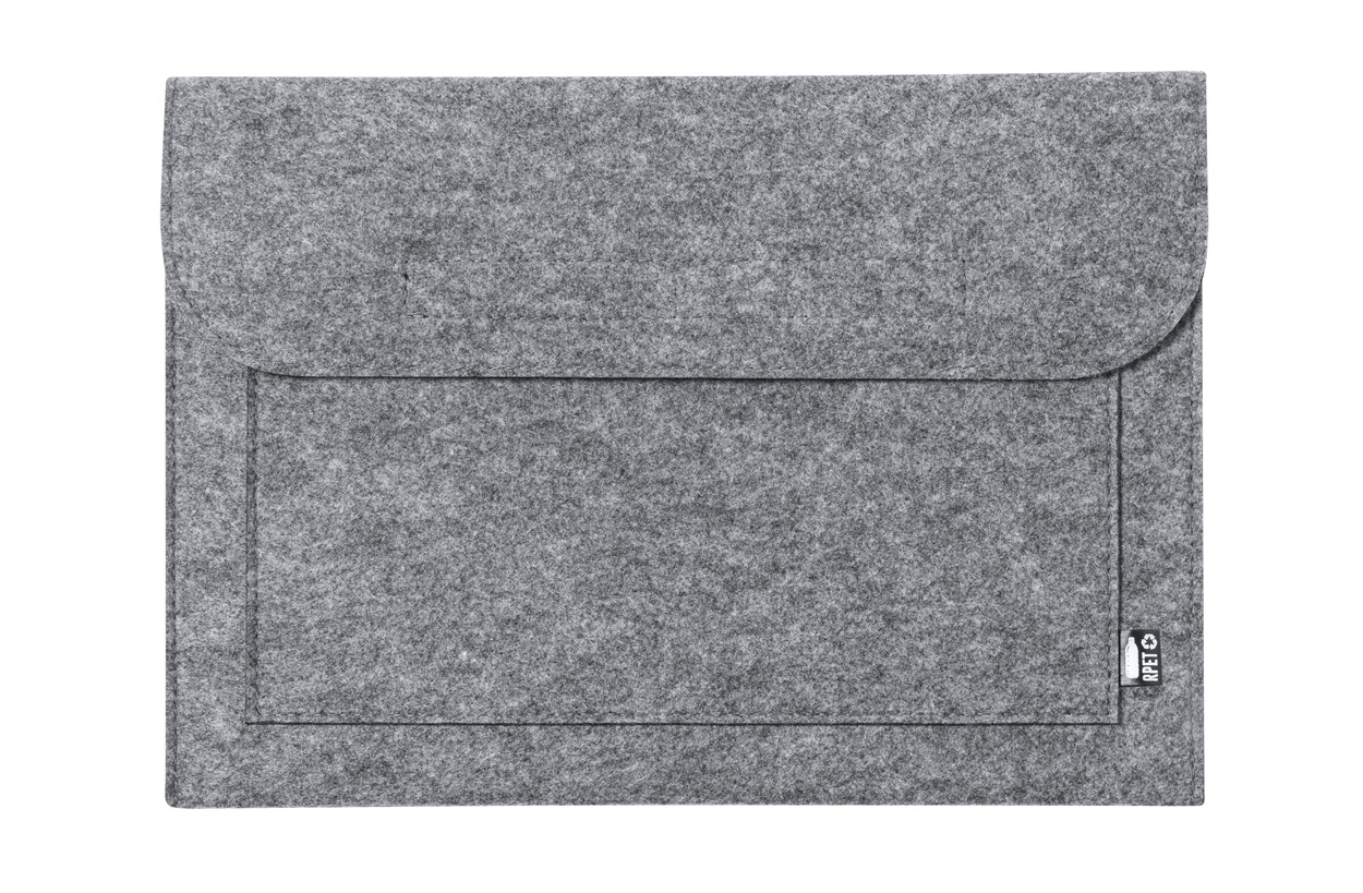 Laptoptasche aus RPET Filz mit Klettverschuss, Seitenfach und RPET-Label.