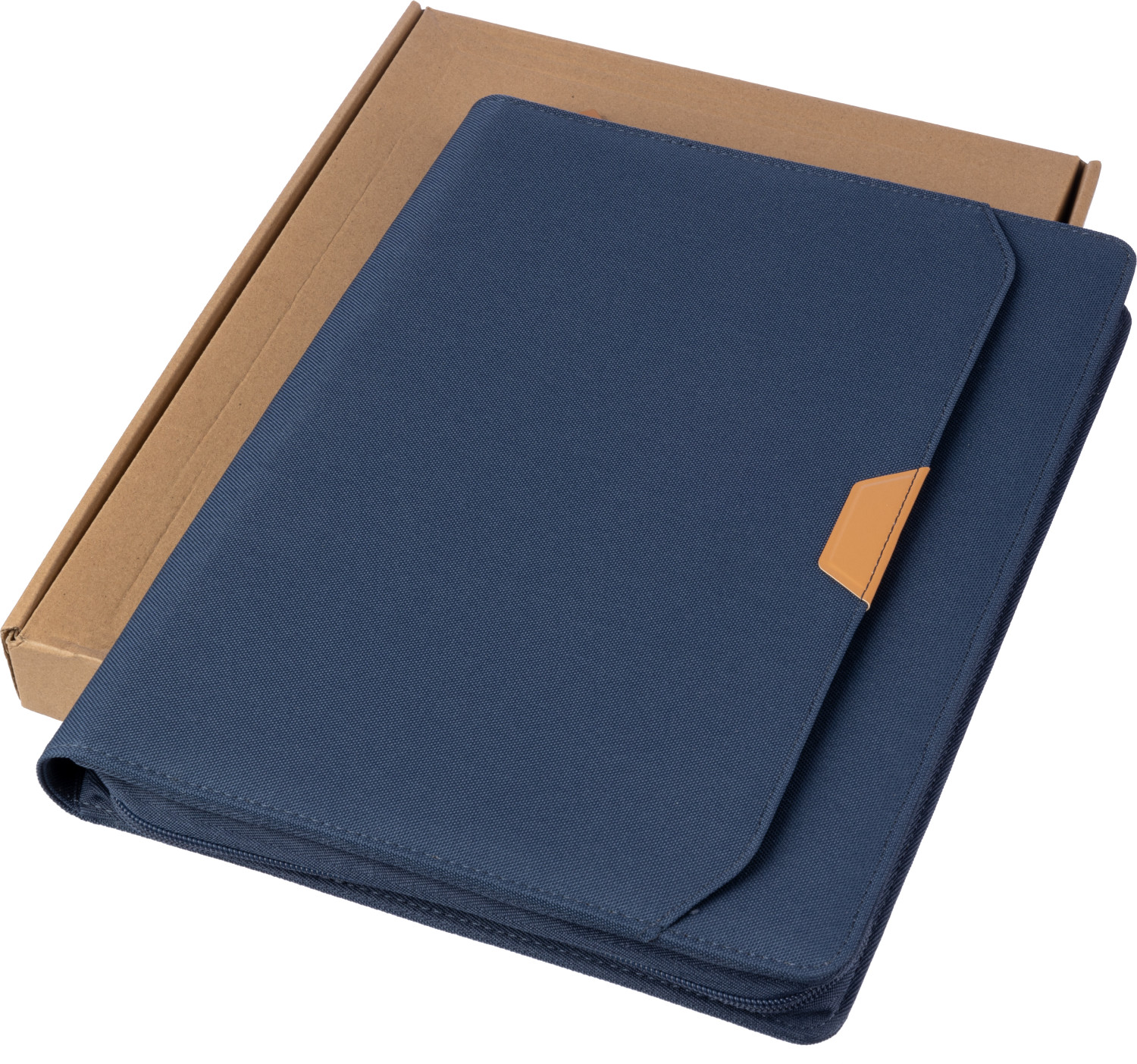 RPET-Mappe (ca. A4) mit PU-Detail und Reißverschluss. Enthält ein Notizbuch mit 20 linierten Seiten (70 g / m²), mehrere Fächer und eine Stiftschlaufe. Kleine Tasche auf der Vorderseite. Einzeln verpackt im braunen Kraftkarton.