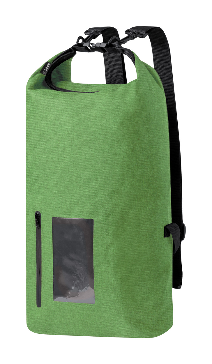 Wasserdichter Matchsack / Rucksack aus 300D RPET-Polyester mit Reißverschlusstasche (touchscreenfähig) und verstellbaren Schultergurten. Fassungsvermögen: 25l.