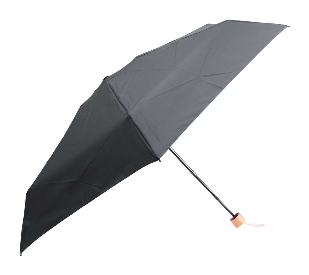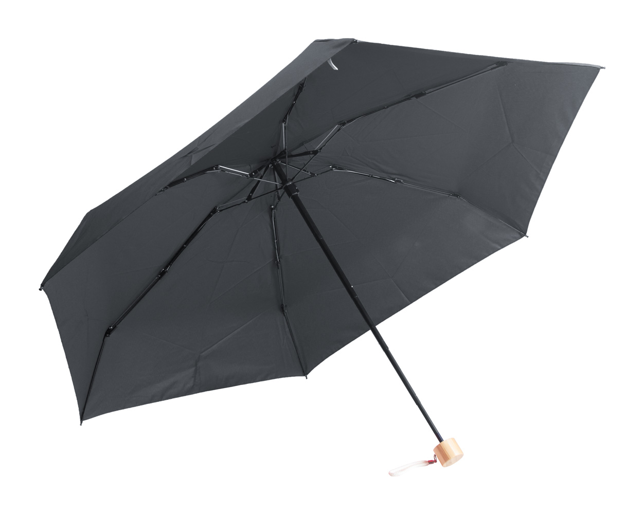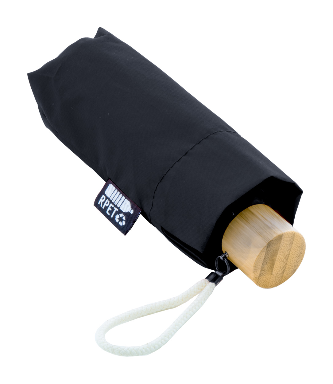 Manueller, 3-fach faltbarer Windproof-Mini-Taschenschirm mit 6 Segmenten in farblich abgestimmtem Etui. Mit Metallrahmen, Fiberglasspeichen, Bambusgriff und Handschlaufe aus Baumwolle. Material: 190T RPET-Pongee. Mit RPET-Label.