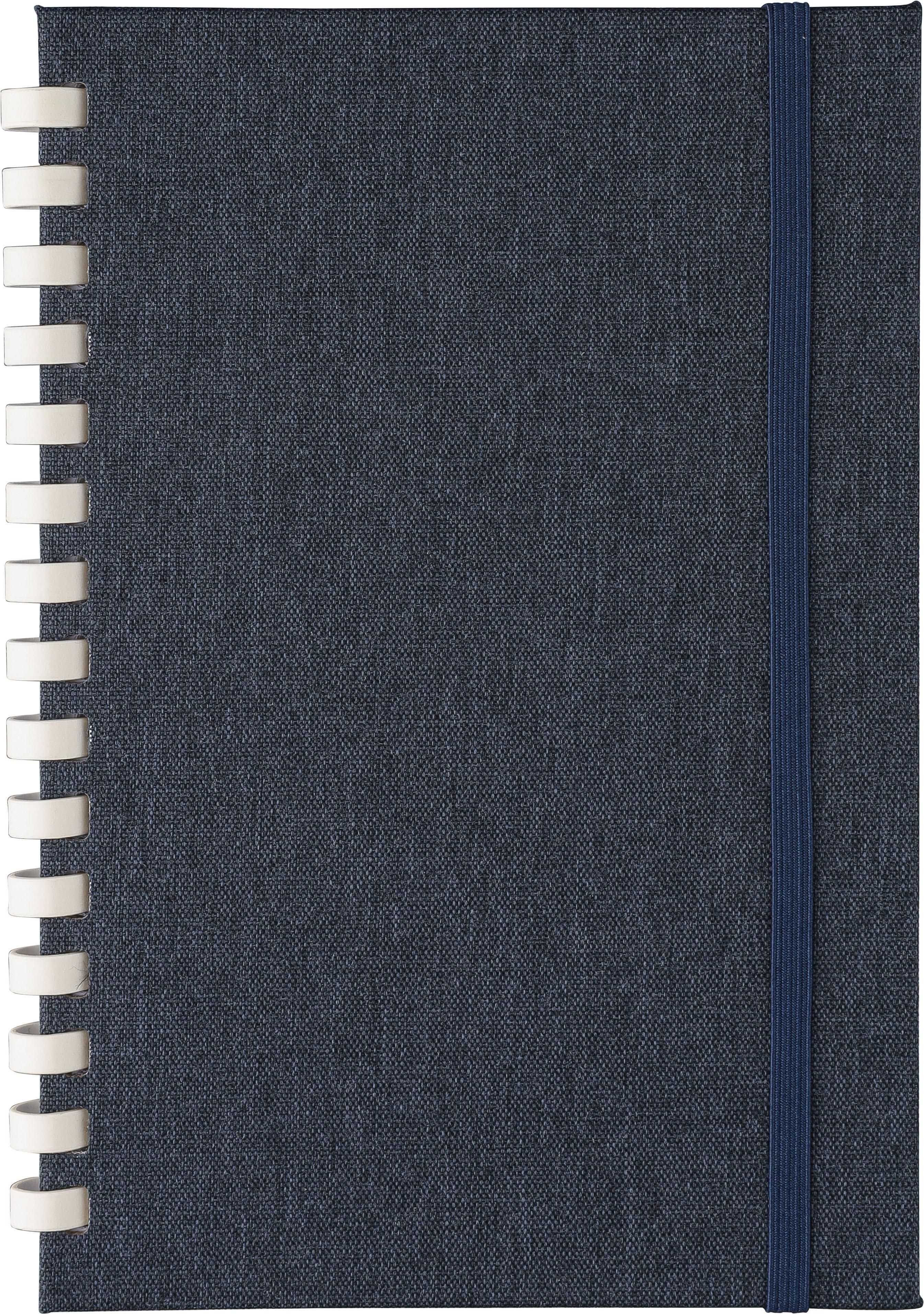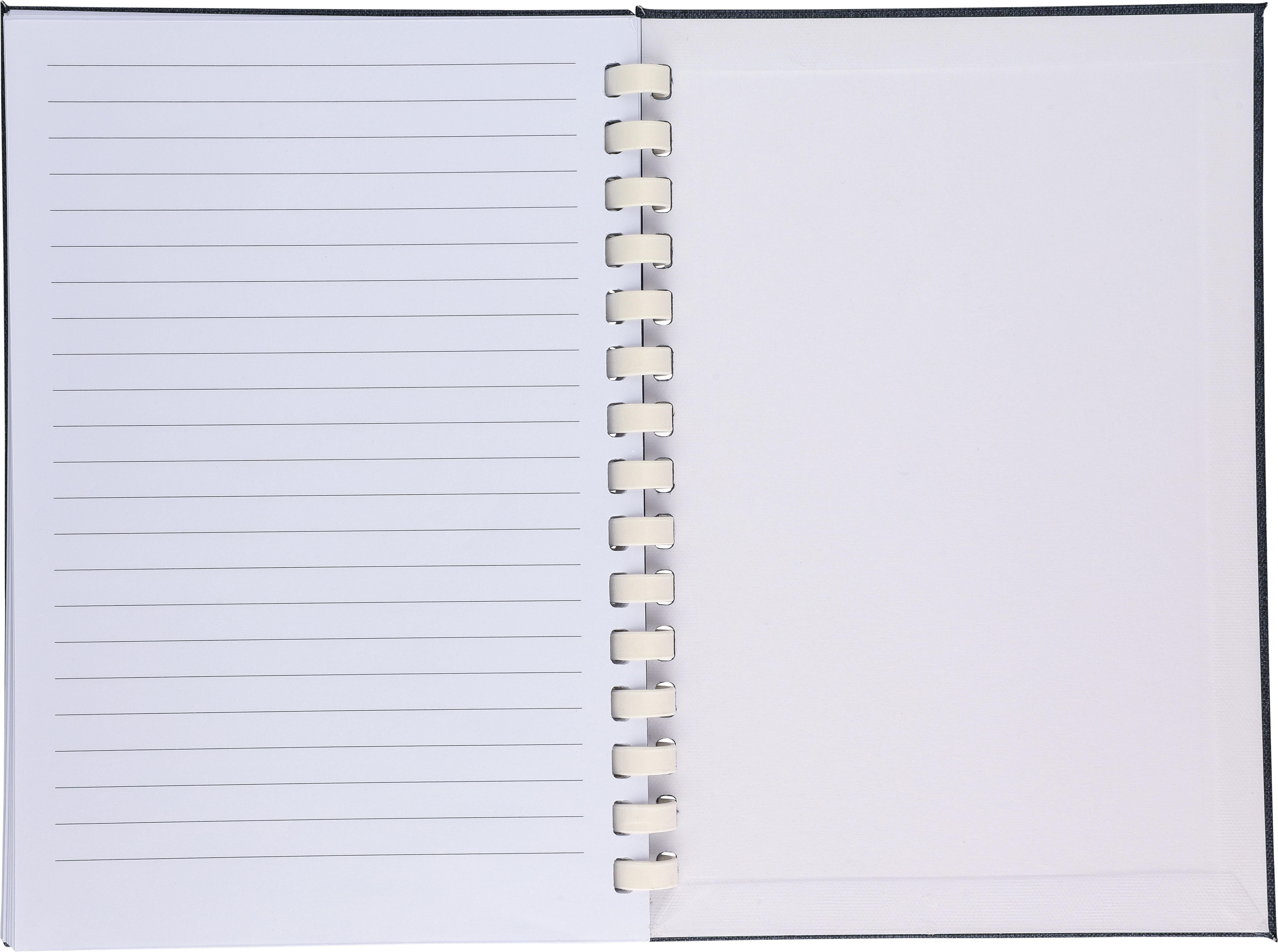 RPET-Notizbuch (ca. A5) mit hartem Einband und elastischem Verschlussband. Es verfügt über eine weiße Pappspirale mit 15 Ringen, ein Lesezeichen mit Band und 80 Blatt (70 g / m²) liniertes Papier. Auf der Rückseite befindet sich ein rPET-Logo. Das Notizbuch ist in Seidenpapier eingewickelt und nicht in einem Polybeutel.