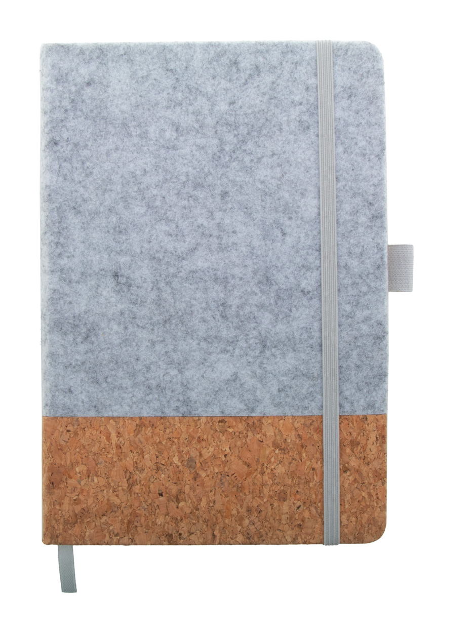 Notizbuch mit RPET-Filz- und Naturkorküberzug. 80 linierten Blätter aus Recyclingpapier. Mit Lesezeichen, Gummiband und Stifthalter. A5-Größe.
