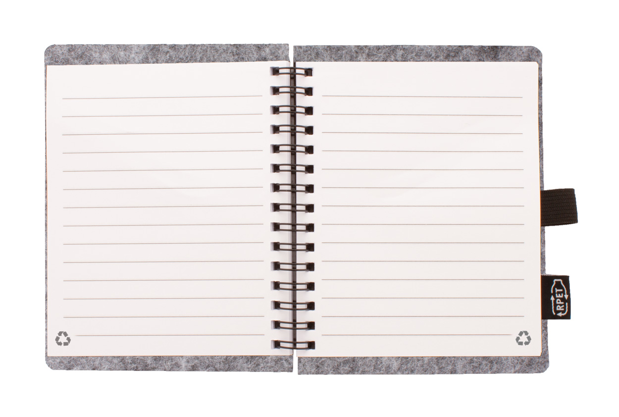 Mit RPET-Filz überzogenes Spiralnotizbuch, RPET-Label und 80 linierten Blättern aus recyceltem Papier. Größe A6.
