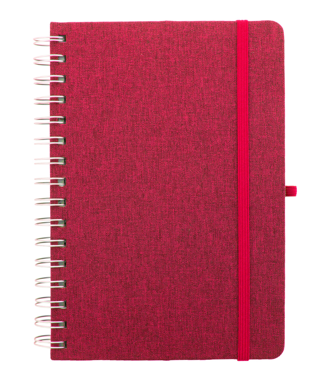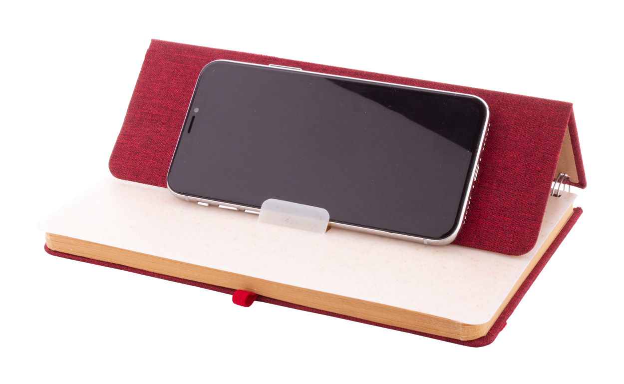 A5 Spiral-Notizbuch mit Umschlag aus RPET Polyester, Handy- und Tablethaltereinsatz aus Weizenstrohkunststoff, 70 linierten Seiten aus recycletem Kraftpapier, Gummiband und Stifteschlaufe.