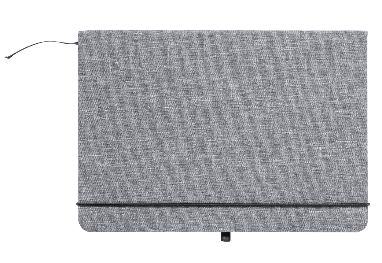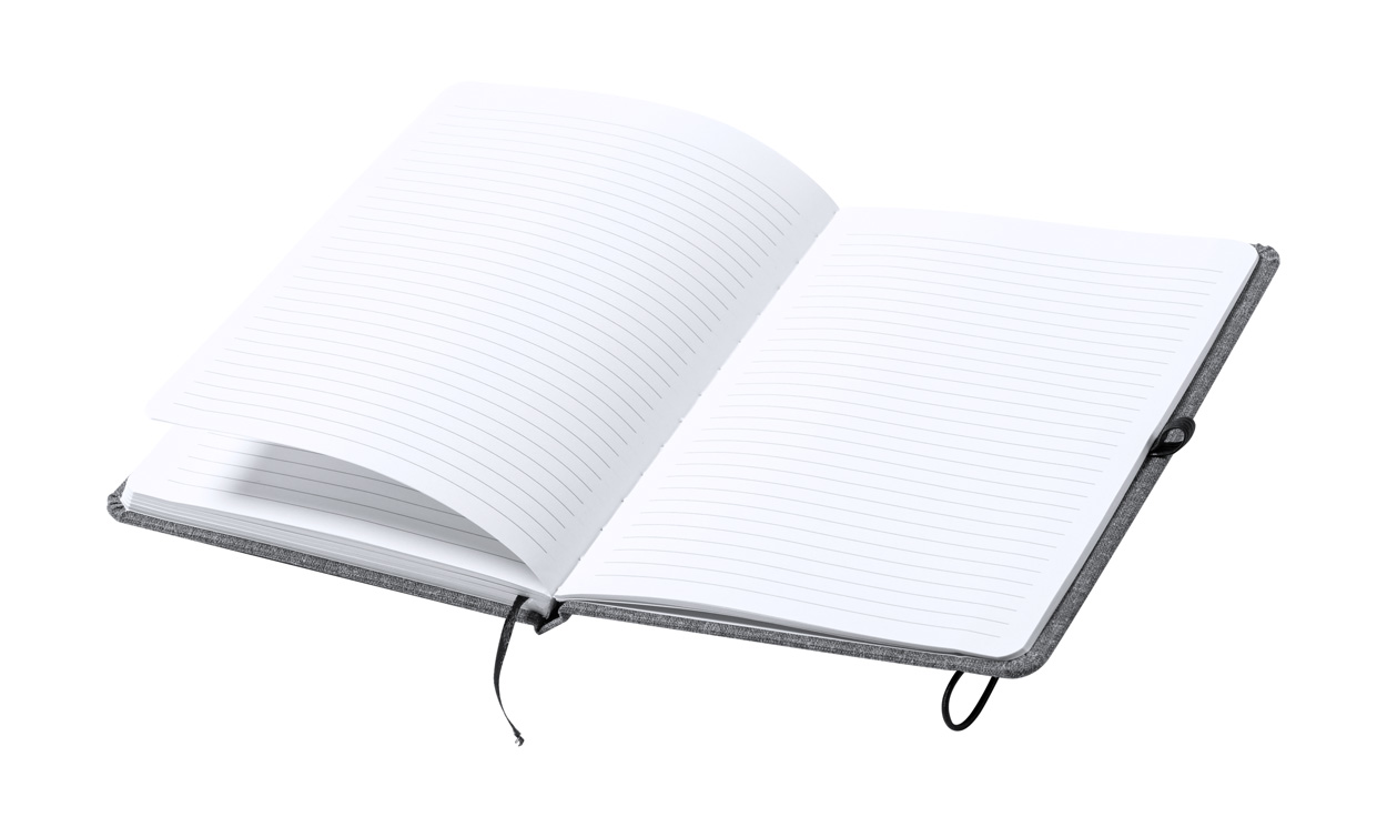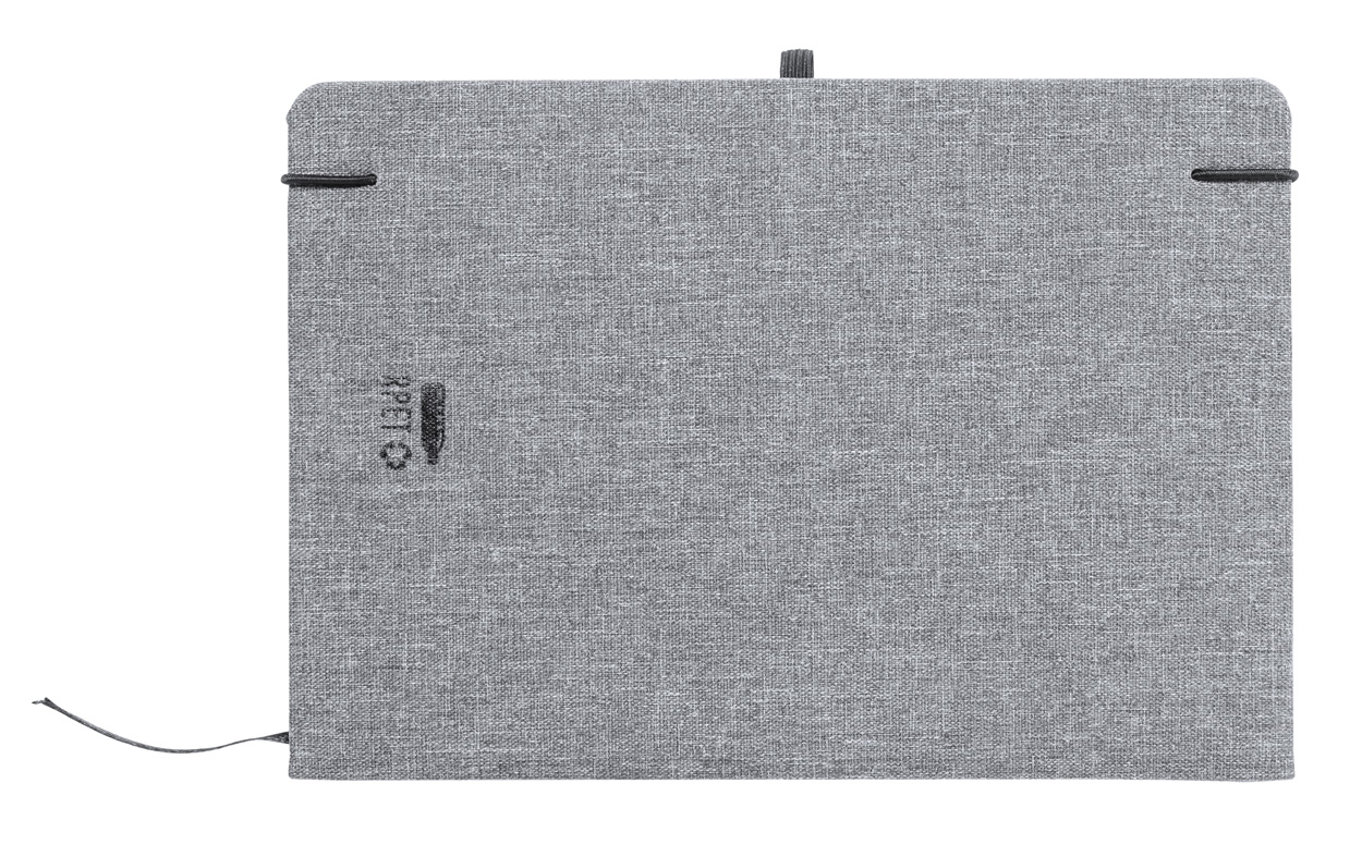 Notizbuch mit 600D RPET-Cover und 100 Seiten (liniert), Lesezeichen und Gummiband. Größe A5.