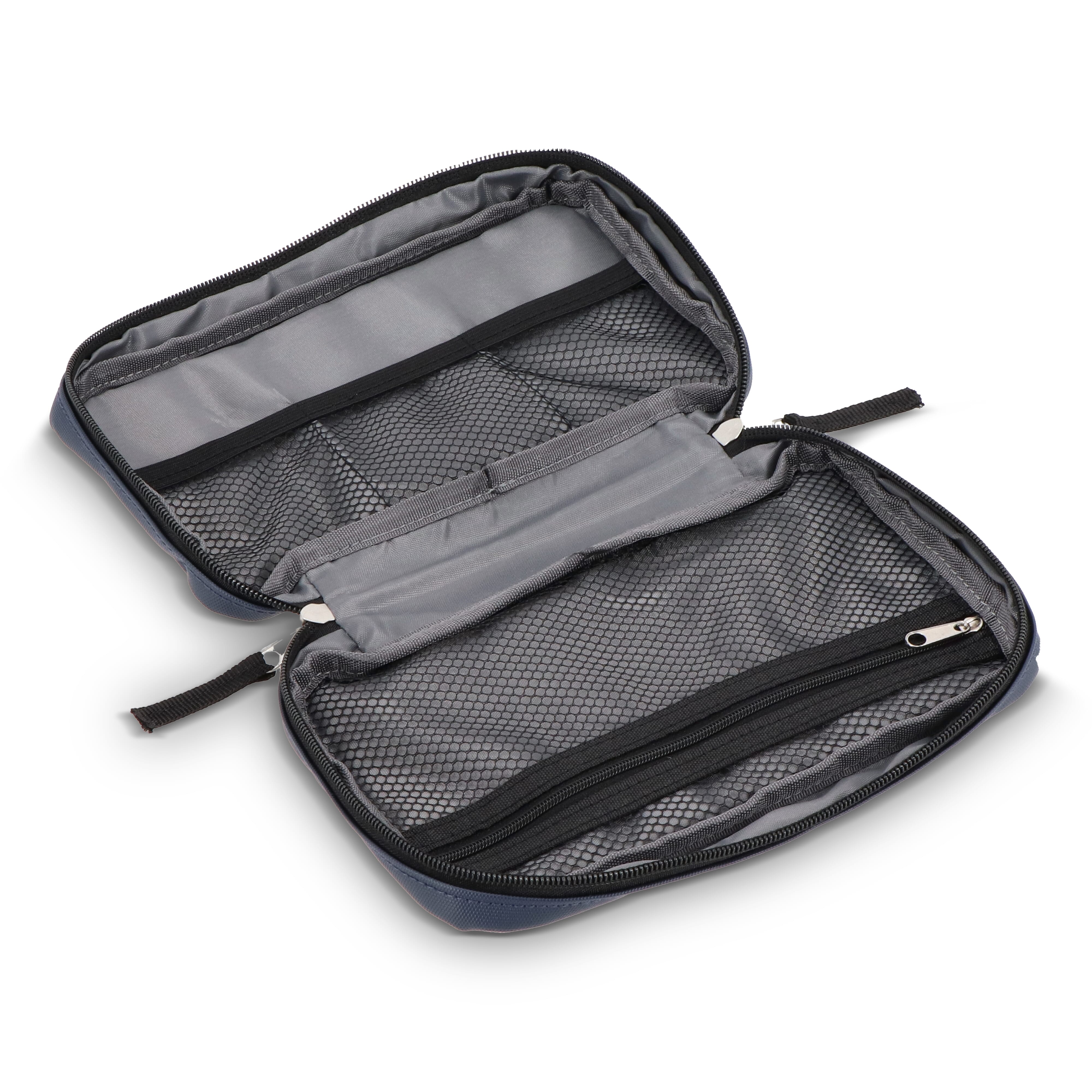 PU-beschichtete rPET 210D-Organizer-Tasche für technische Geräte. Mit Handschlaufe zum einfachen Tragen, einer großen Reißverschlusstasche und drei kleineren Taschen für Kabel, Ladegeräte, Powerbanks und mehr. Dank doppeltem Reißverschluss von beiden Seiten zu öffnen. Ideal für Reisen.