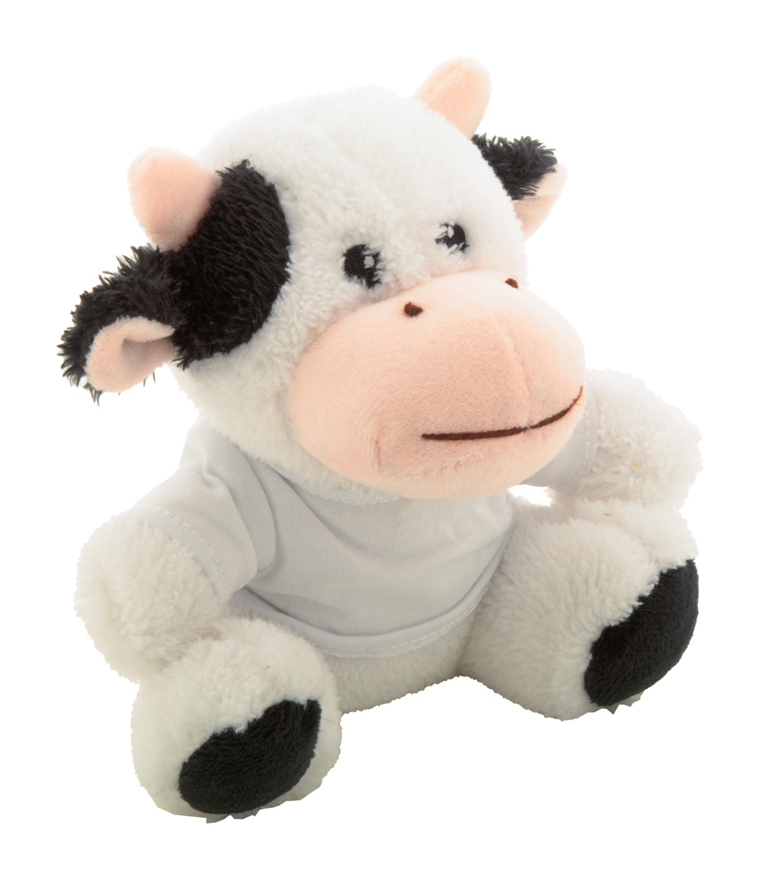 RPET-Plüschkuh mit bedruckbarem T-Shirt aus RPET-Polyester. Bestellungen ohne Druck werden mit abgenommenem T-Shirt geliefert.