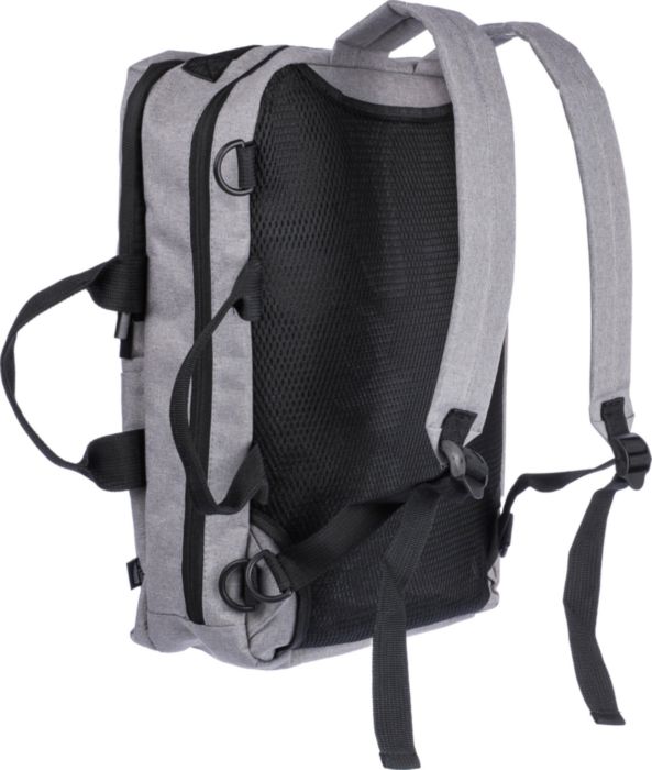 Rucksack und Laptoptasche (15”) aus rPET-Polyester (300D) mit 210D-Innenfutter. Mit Trageschlaufe oben, verstellbaren Schultergurten und zwei seitlichen Tragegriffen. Verstellbare Riemen hinter der Polsterung zum Tragen mit seitlichen Griffen. Laptopfach mit Klettverschluss und kleines Reißverschlussfach. Mit belüfteter, gepolsterter Rückwand. Tragegewicht ca. 8 kg. Inklusive rPET-Etikett.